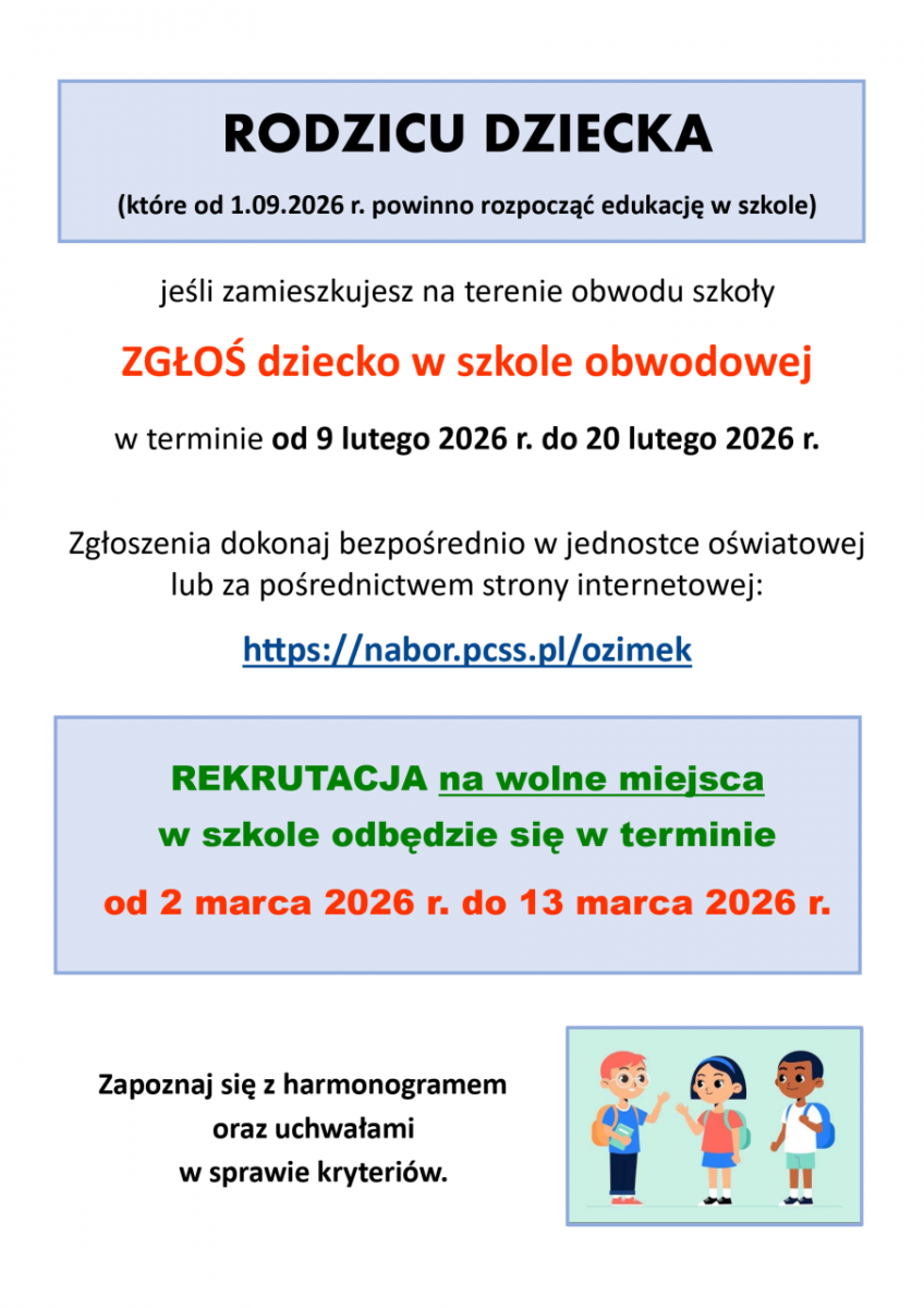 Rodzice dzieci, które od 1 września 2026 roku powinny rozpocząć naukę w klasie pierwszej i zamieszkują w obwodzie szkoły, są zobowiązani do zgłoszenia dziecka do szkoły obwodowej w terminie od 9 lutego 2026 do 20 lutego 2026 r.