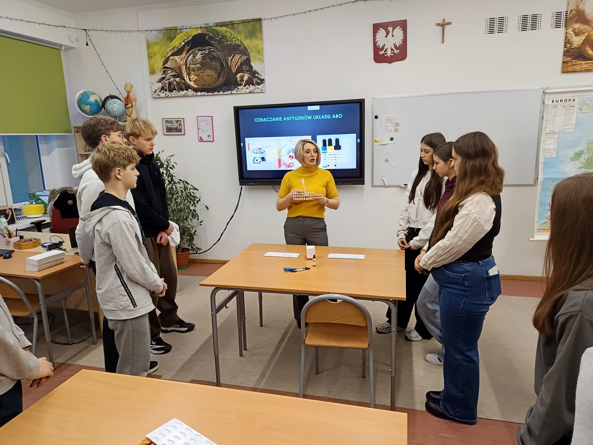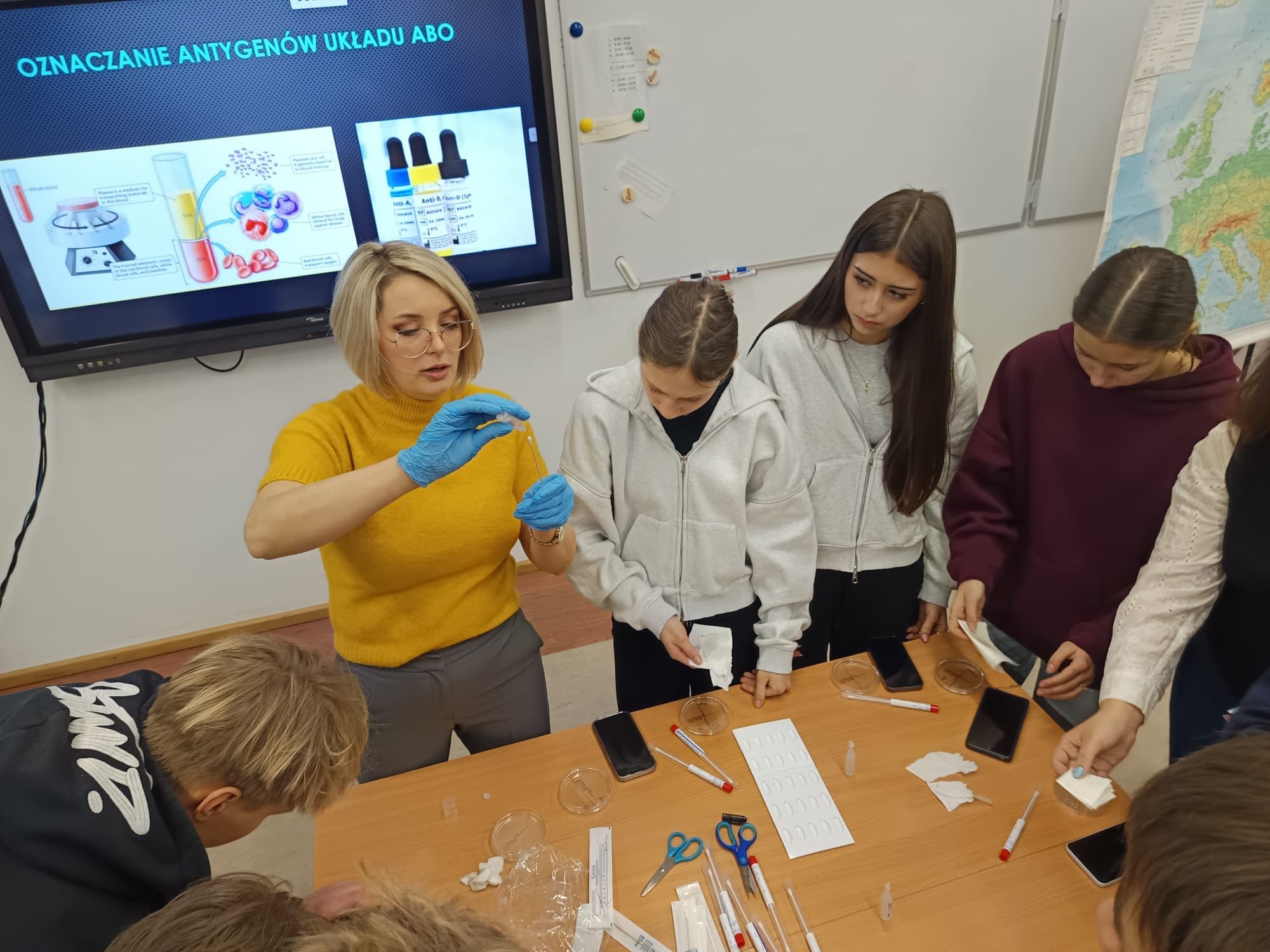Pani Iryna, prywatnie mama dwóch uczennic naszej szkoły, na zaproszenie Nauczycielek biologii – Pani Małgorzaty Szury oraz Pani Anny Zawiei – podzieliła się z młodzieżą swoją specjalistyczną wiedzą oraz doświadczeniem zawodowym. Spotkanie było nie tylko cenną lekcją teorii, ale przede wszystkim praktycznym wprowadzeniem w świat badań laboratoryjnych.