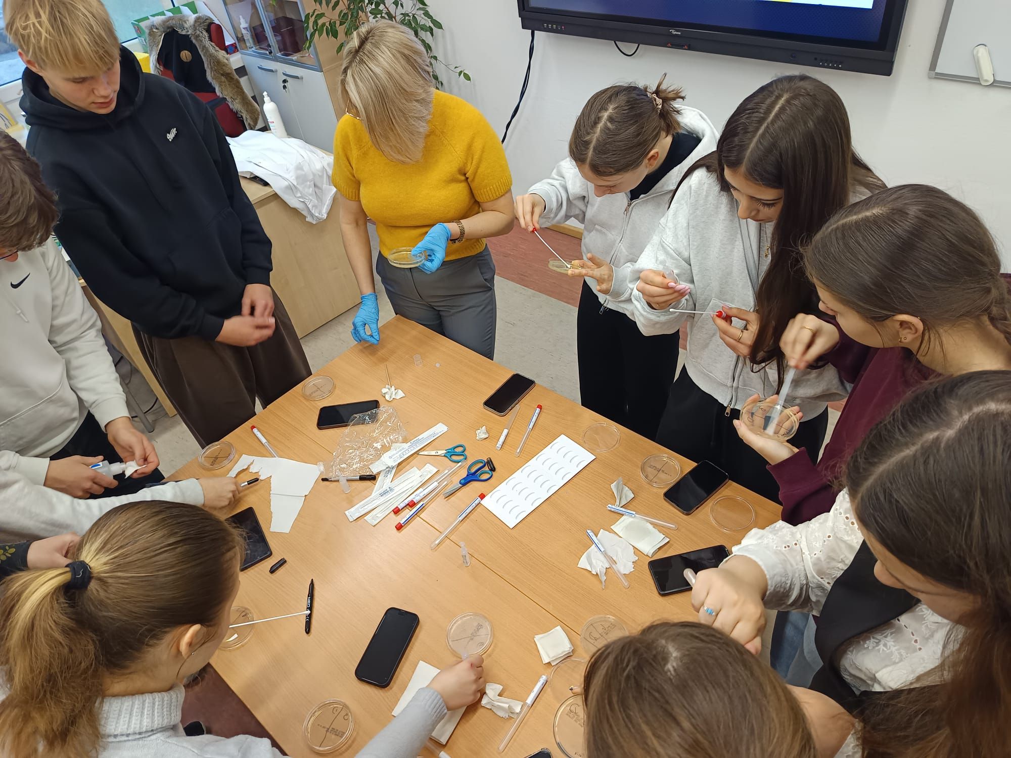 Następnie przyszedł czas na praktykę. Uczniowie samodzielnie oznaczali grupę losowej próbki krwi, a następnie analizowali, jaką grupę krwi można byłoby bezpiecznie przetoczyć oraz dlaczego zgodność grup krwi jest tak istotna. Kolejnym zadaniem był posiew mikrobiologiczny na pożywce agarowej. Materiał badawczy stanowił wymaz z telefonu komórkowego. Uzyskane wyniki okazały się bardzo interesujące – poziom „czystości” pozostanie jednak naszą małą tajemnicą.