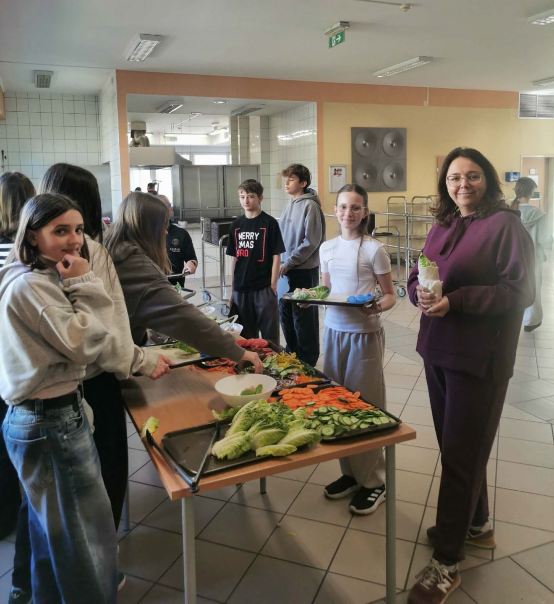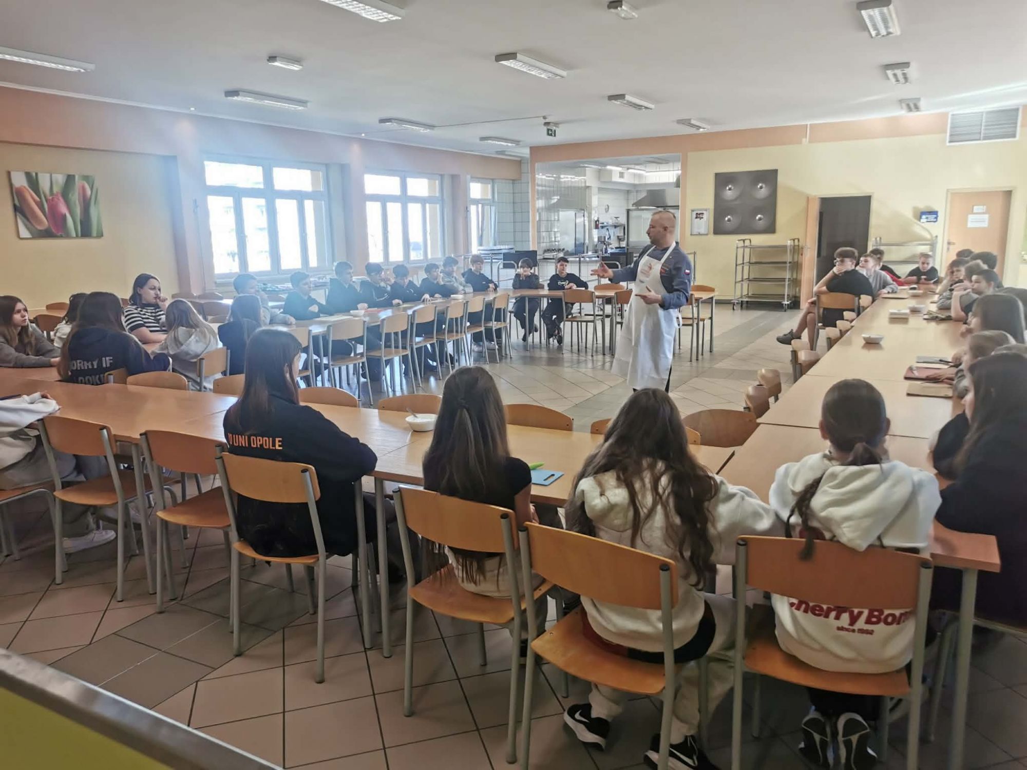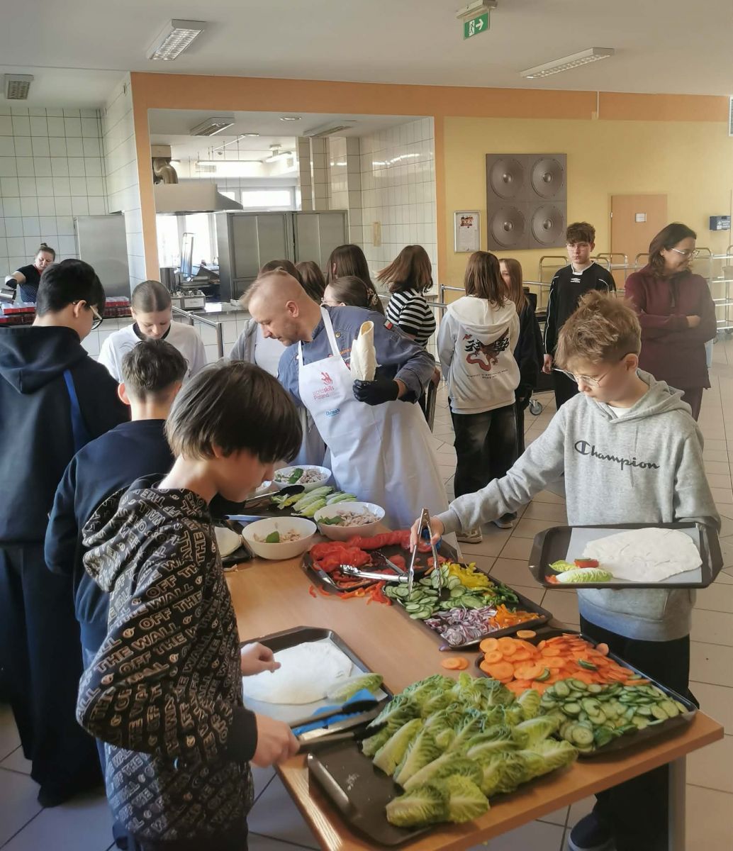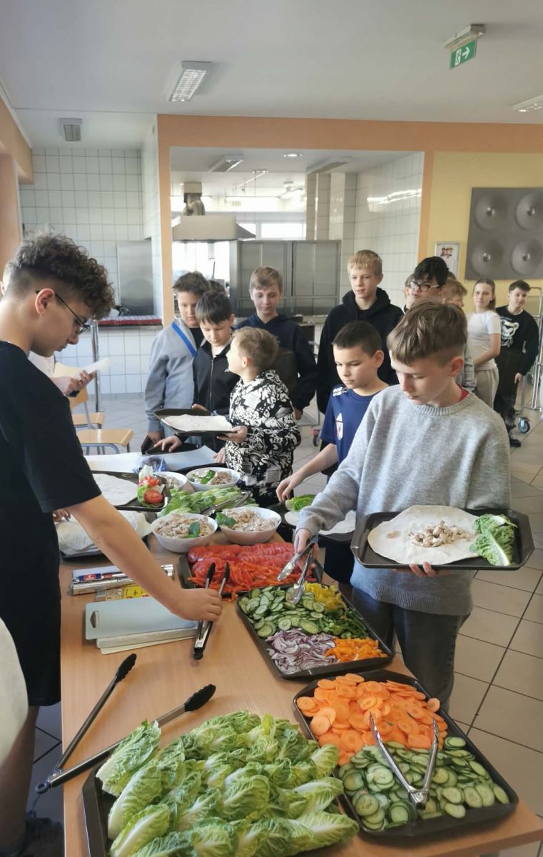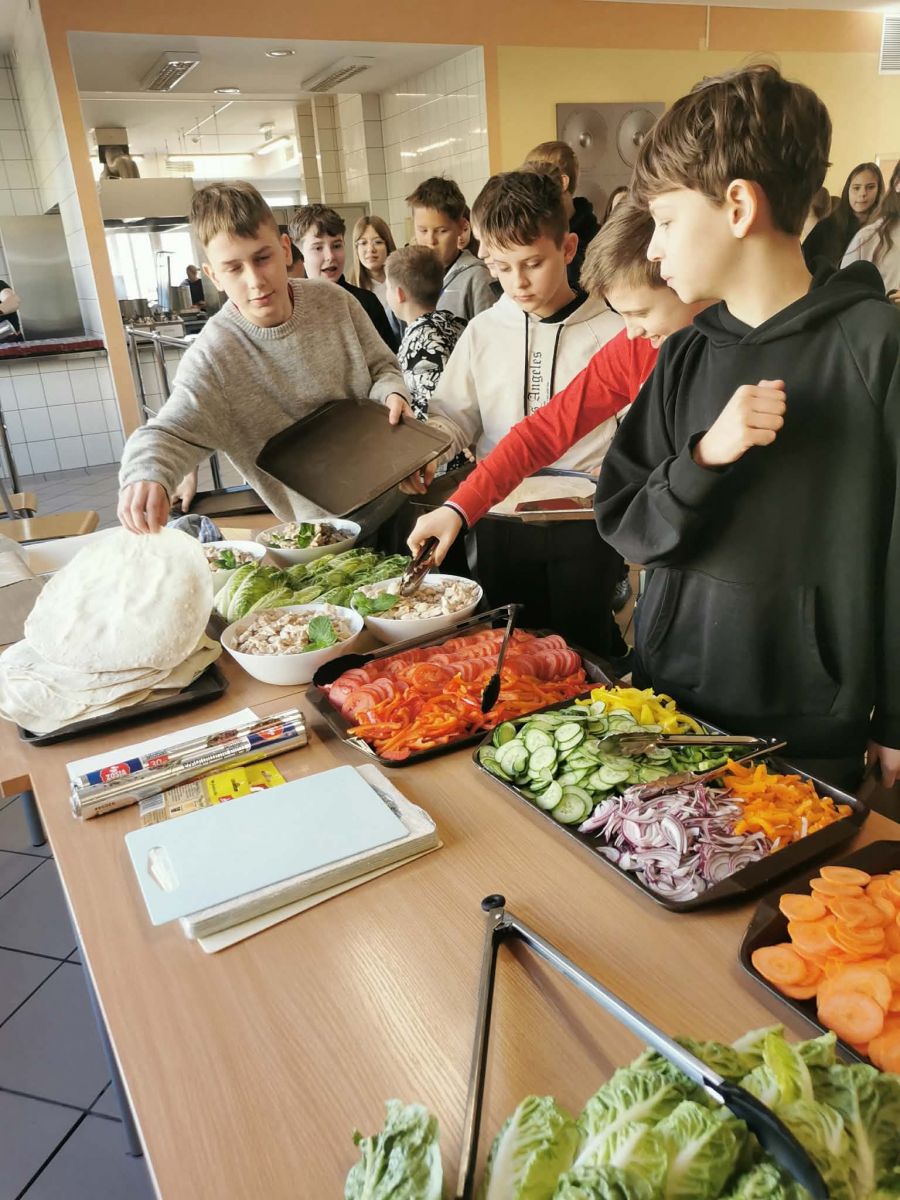 Kolejnym etapem były zajęcia praktyczne, podczas których uczniowie mogli wykorzystać zdobytą wiedzę w działaniu. Pod okiem profesjonalnego szefa kuchni przygotowywali popularne danie w zdrowszej, „odchudzonej" wersji, przekonując się, że ulubiony fast food może być jednocześnie smaczny i wartościowy. Praca w kuchni była nie tylko ciekawą formą nauki, ale także okazją do rozwijania samodzielności, kreatywności oraz współpracy w grupie.