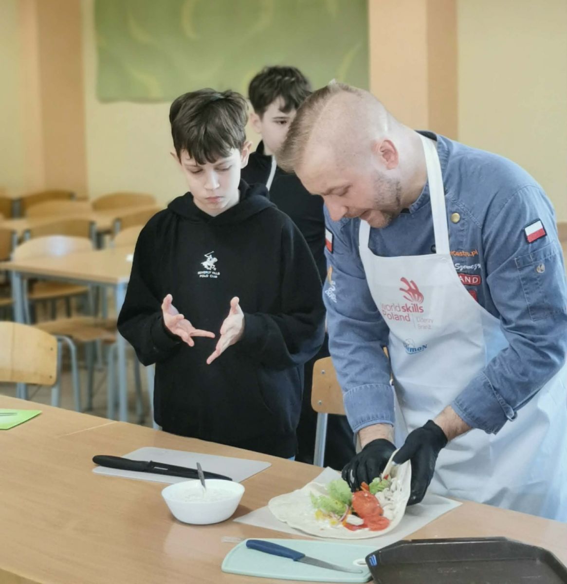 Warsztaty poprowadził Pan Łukasz Szewczyk – doświadczony i utytułowany szef kuchni, zdobywca medali podczas Międzynarodowej Olimpiady Kulinarnej IKA 2020. Współautor jednej z najpopularniejszych polskich książek o carvingu, organizator licznych szkoleń i pokazów kulinarnych oraz specjalista w dziedzinie kuchni molekularnej. Spotkanie z tak uznanym profesjonalistą było dla uczniów niezwykle inspirującym doświadczeniem i pozwoliło spojrzeć na gotowanie z zupełnie nowej perspektywy.