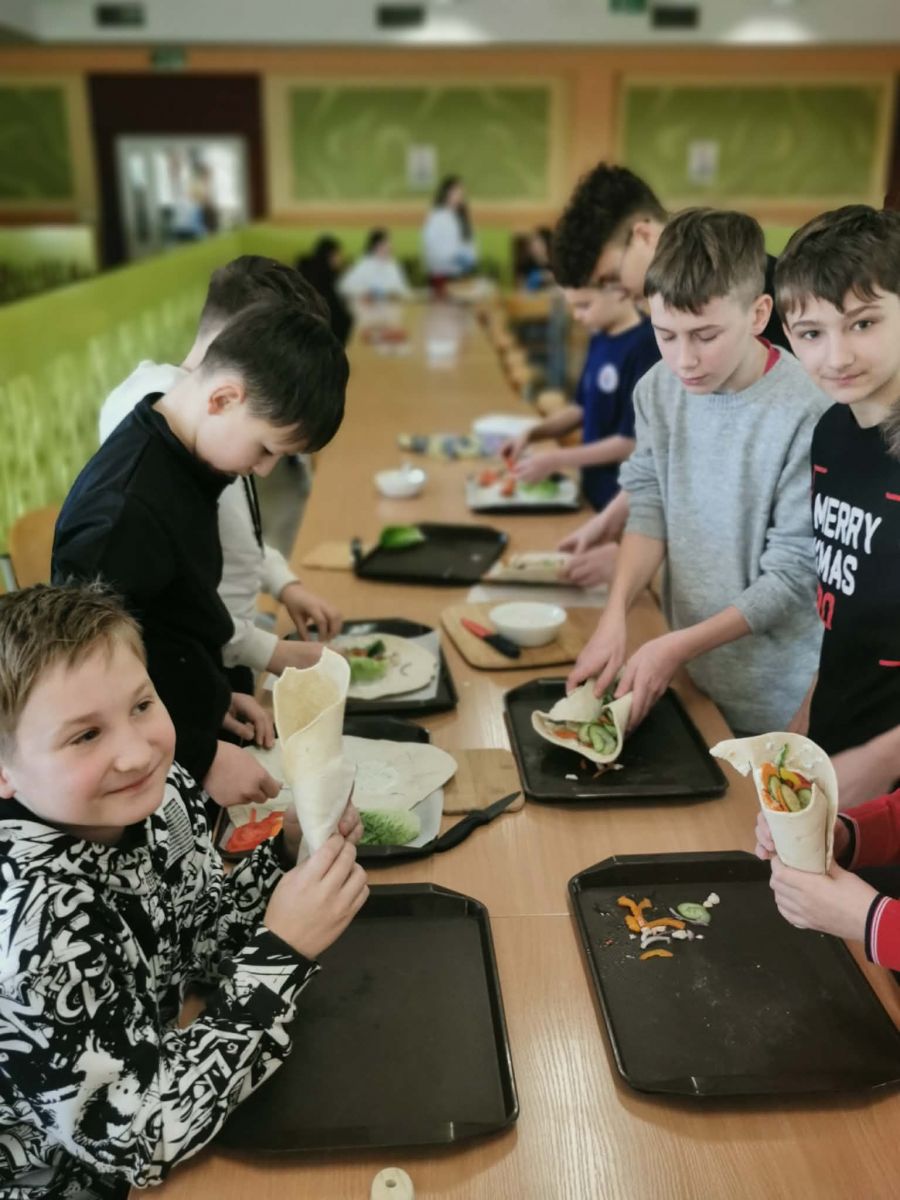 Współczesna dieta młodych ludzi nie rzadko obfituje w produkty typu fast food, które choć smaczne i łatwo dostępne, zazwyczaj są wysoko przetworzone i niezbyt korzystne dla zdrowia. Zawierają duże ilości tłuszczu, soli oraz cukru, a jednocześnie niewiele wartościowych składników odżywczych. Dlatego tak ważne jest pokazywanie młodzieży, że ulubione potrawy można przygotować w znacznie zdrowszej, lżejszej i bardziej wartościowej wersji. Taki właśnie cel przyświecał warsztatom kulinarnym zorganizowanym dla uczniów klas 6b i 6c w ramach zajęć edukacji zdrowotnej pod hasłem „Fast Food inaczej, czyli zdrowiej".