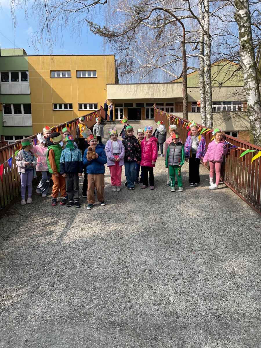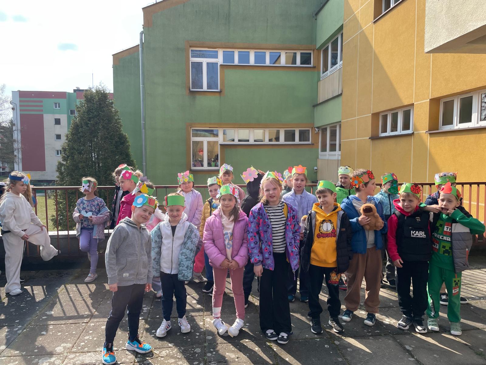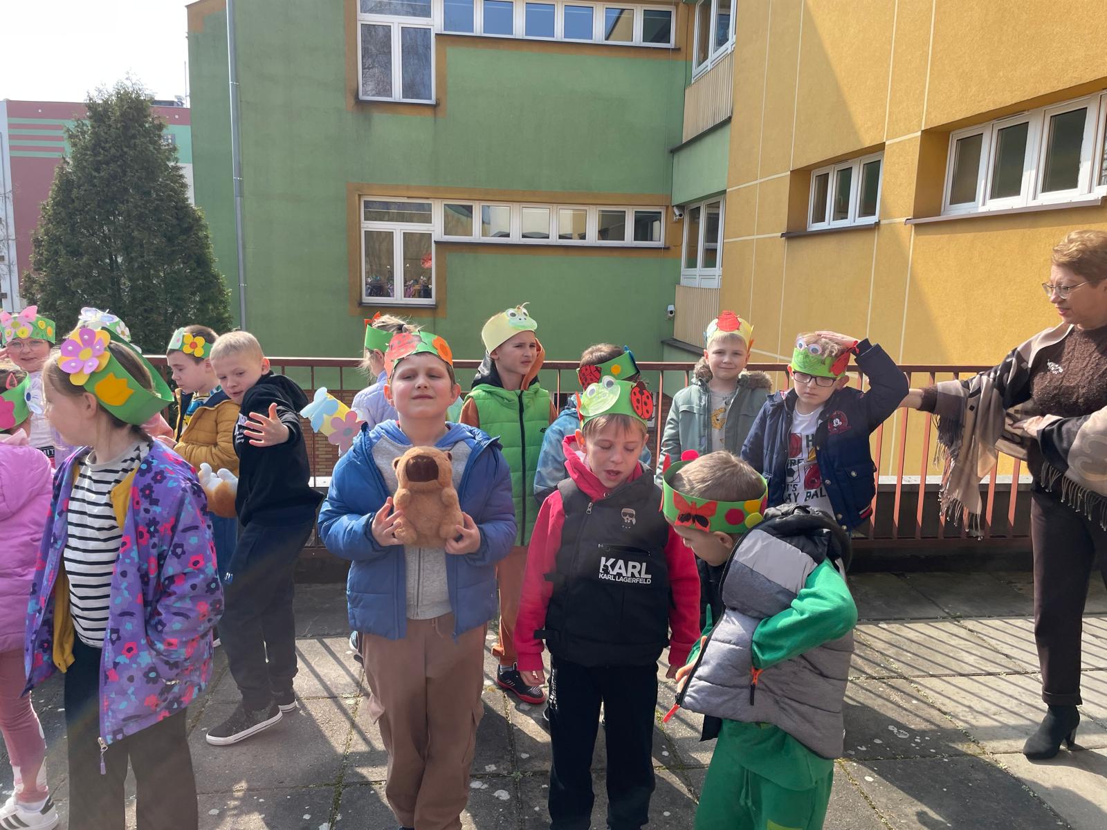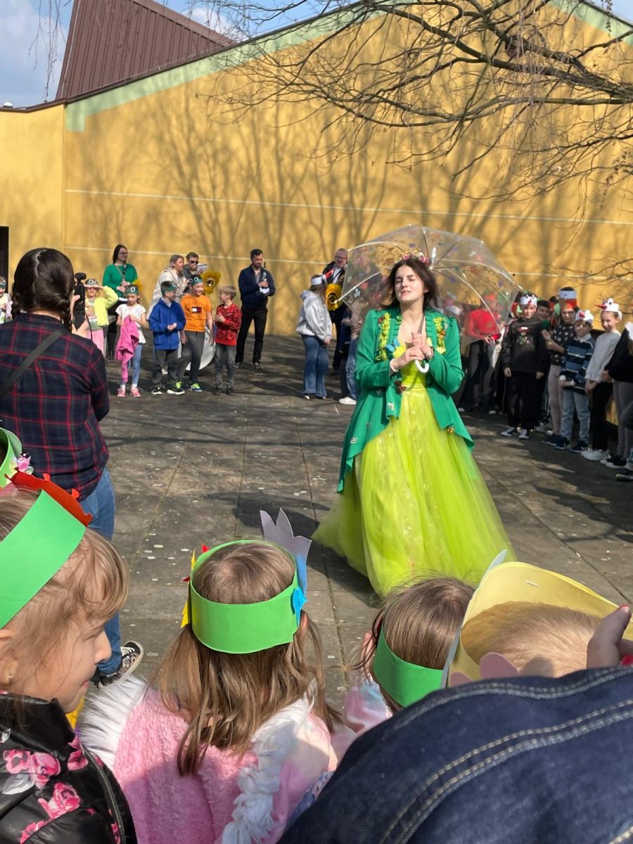 Już z daleka było słychać nasze dzieci, które z ogromnym entuzjazmem śpiewały piosenkę „Idzie Wiosna”. To właśnie ich radosny śpiew sprawił, że Pani Wiosna postanowiła odwiedzić naszą szkołę. Podczas spotkania rozmawiała z uczniami o oznakach wiosny, o tym, dlaczego warto mieć przy sobie parasol oraz dlaczego powinniśmy cieszyć się każdą pogodą – nawet deszczem, który daje życie roślinom. Opowiadała również o nasionkach i zachęcała dzieci do ich sadzenia, aby świat wokół nas był tak zielony i piękny jak jej kwiecisty strój.