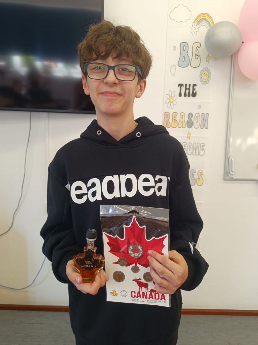 Uczniowie mieli wyjątkową okazję przenieść się za ocean dzięki prezentacji przygotowanej przez Kubę Boguckiego z klasy 5C. Kuba opowiedział o Kanadzie, w której się urodził i spędził aż 9 lat. Podzielił się wieloma ciekawostkami o tym kraju, a także zaprezentował przywiezione pamiątki – syrop klonowy, walutę, magnesy oraz flagę.