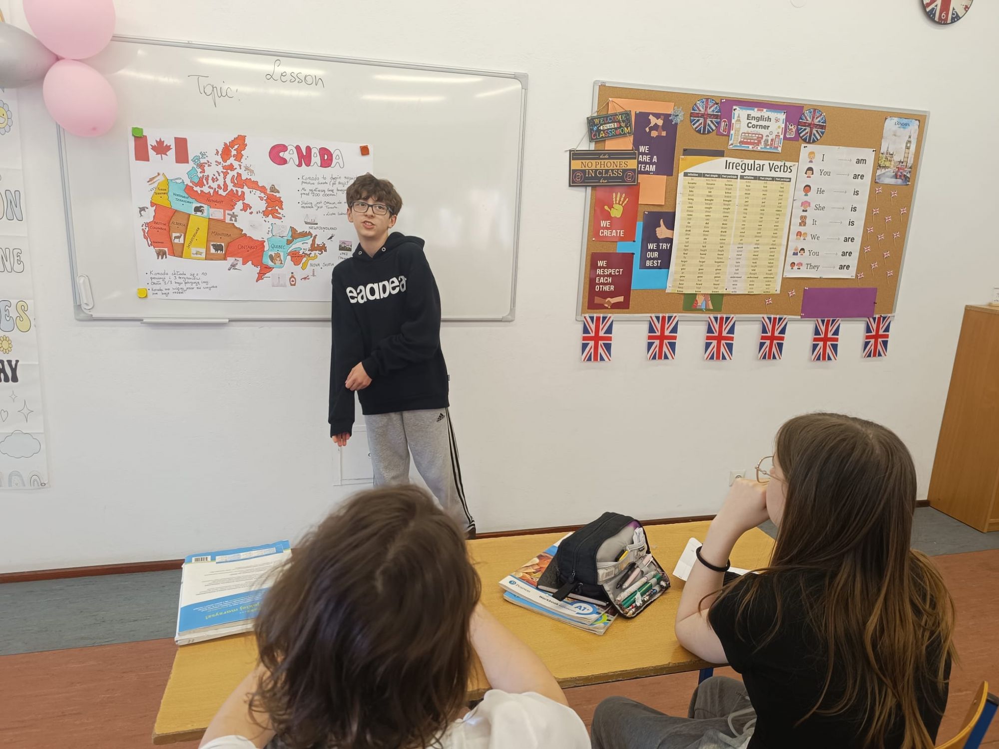 Prezentacja wzbudziła duże zainteresowanie wśród uczniów. Nie zabrakło pytań – szczególnie o życie szkolne w Kanadzie. Uczniowie chcieli wiedzieć m.in., czy można korzystać z telefonu w szkole, ile jest sprawdzianów w tygodniu oraz czy uczniowie dużo piszą. Kuba chętnie odpowiadał na wszystkie pytania, dzieląc się swoimi doświadczeniami.