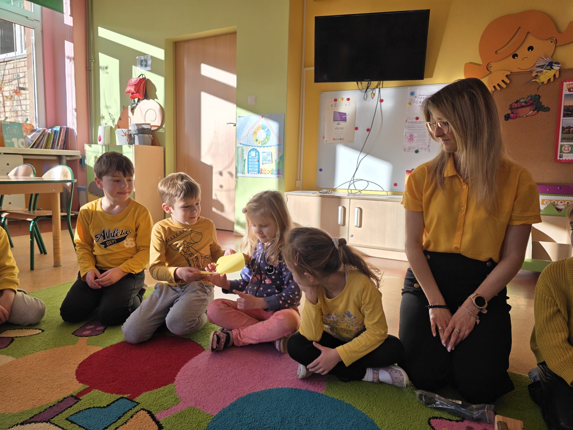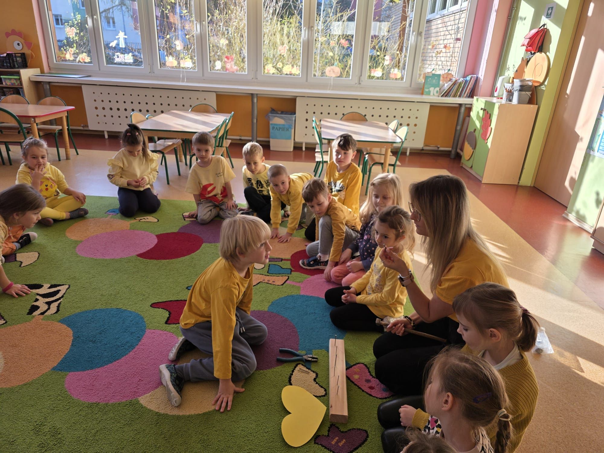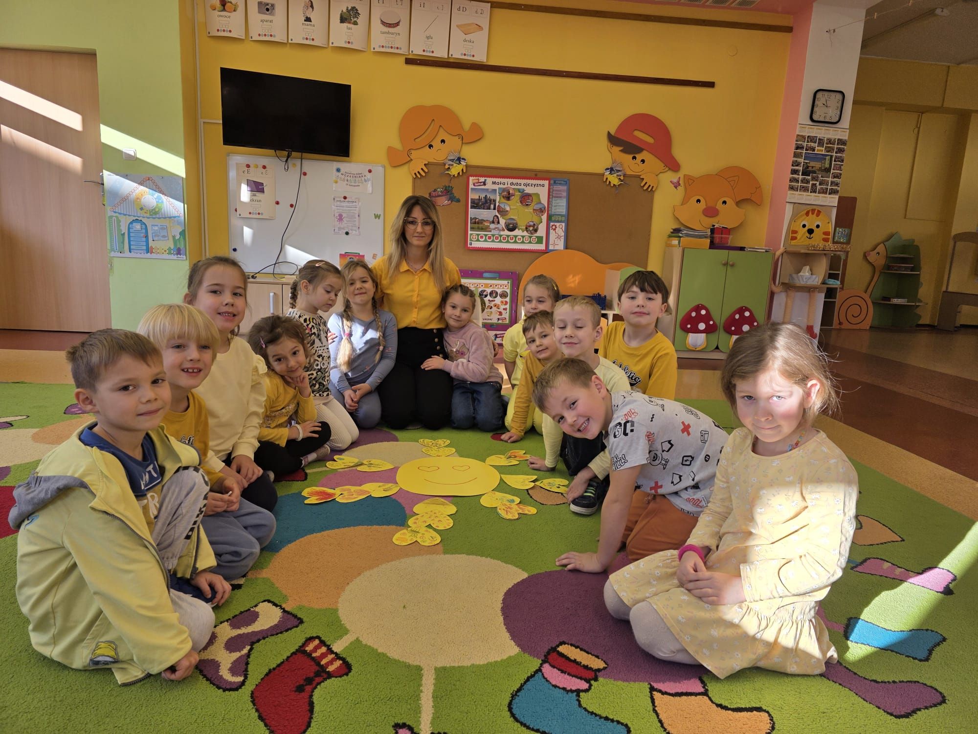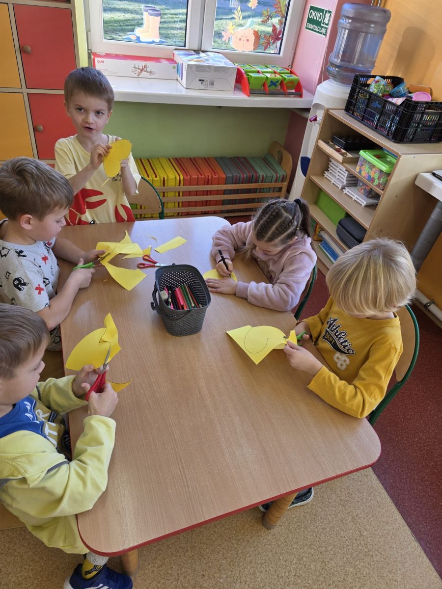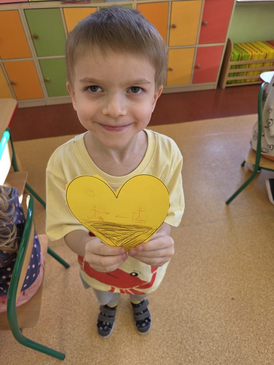 Dzieci wykonały swoje serduszka przedstawiające miłe gesty, dobre uczynki i symbole radości, które następnie zostały ułożone w formie życzliwych promyków.