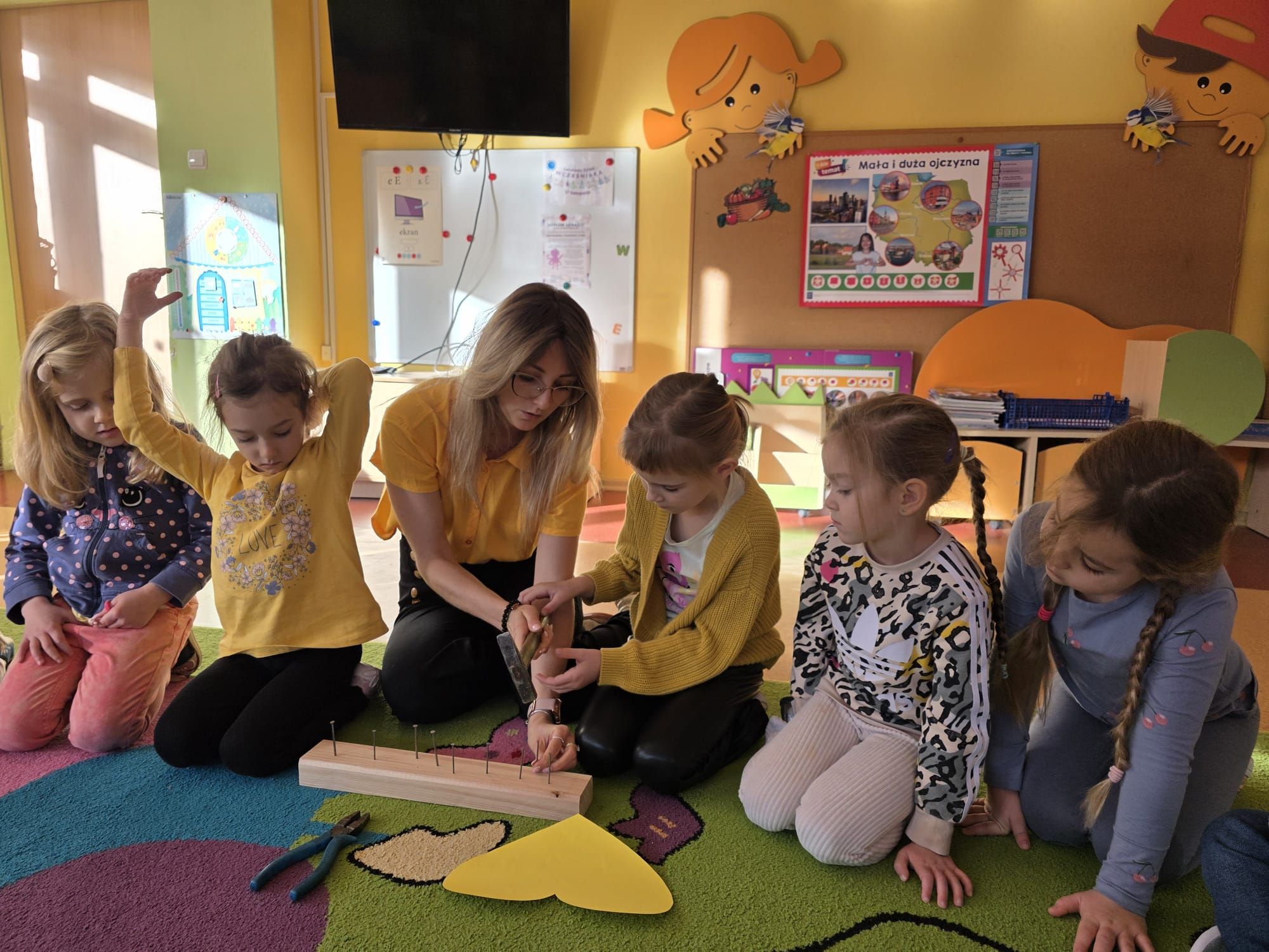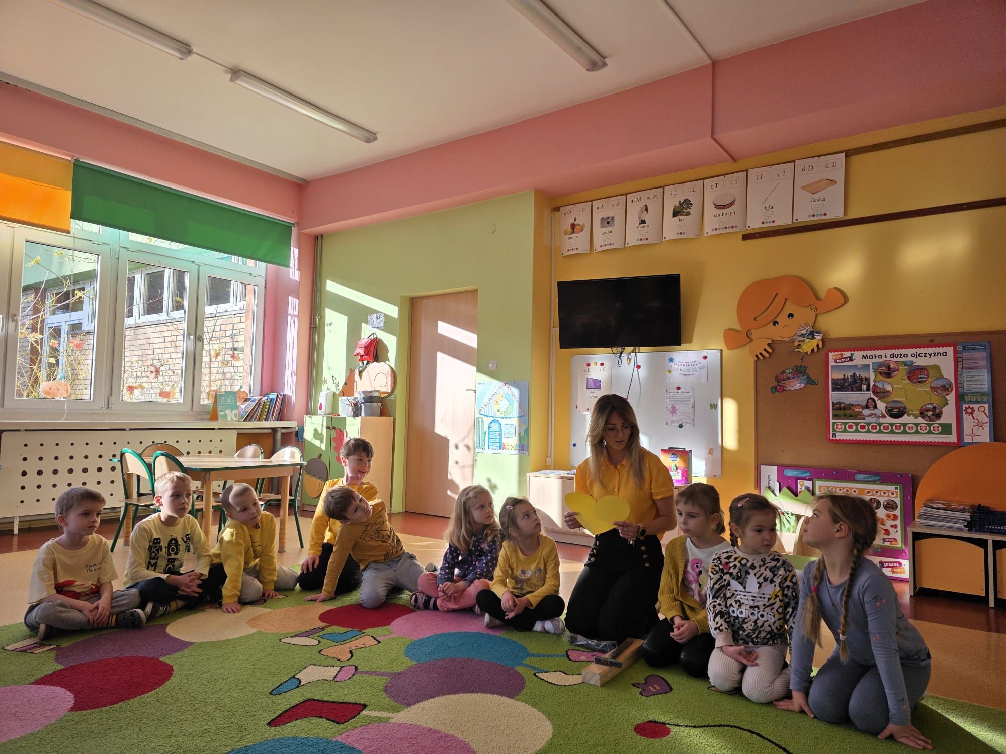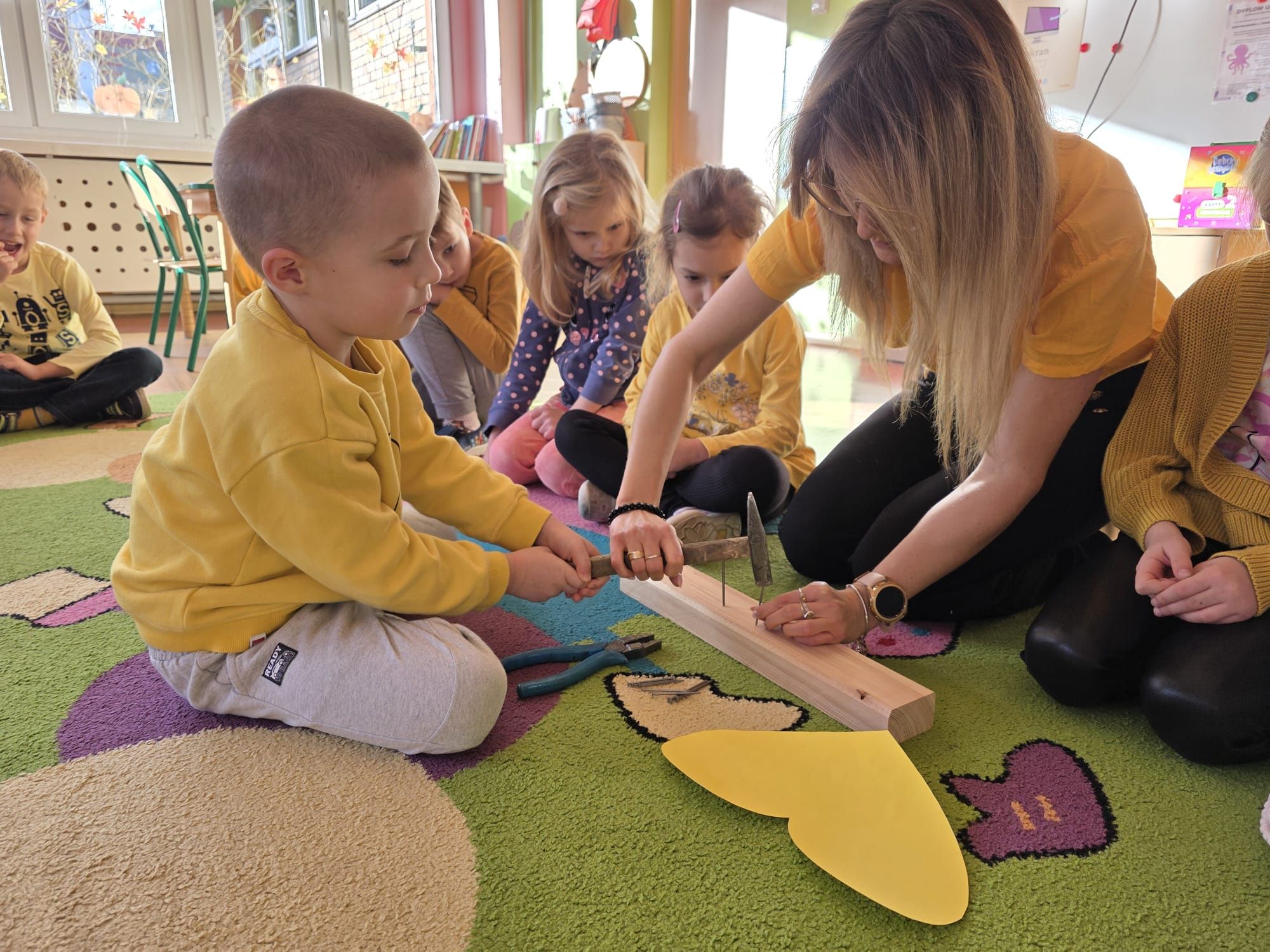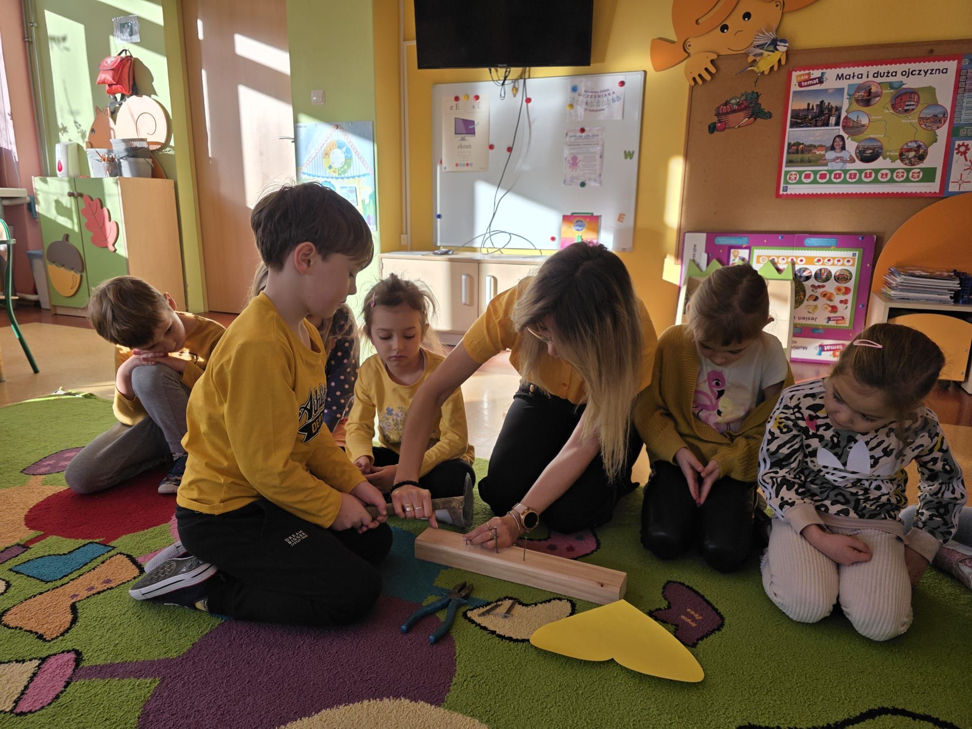 Dzieci wykonały swoje serduszka przedstawiające miłe gesty, dobre uczynki i symbole radości, które następnie zostały ułożone w formie życzliwych promyków.