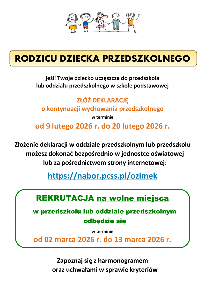 Informujemy, że 9 lutego rozpocznie się nabór dzieci do Oddziału Przedszkolnego przy Szkole Podstawowej nr 3 w Ozimku na rok szkolny 2026/2027.