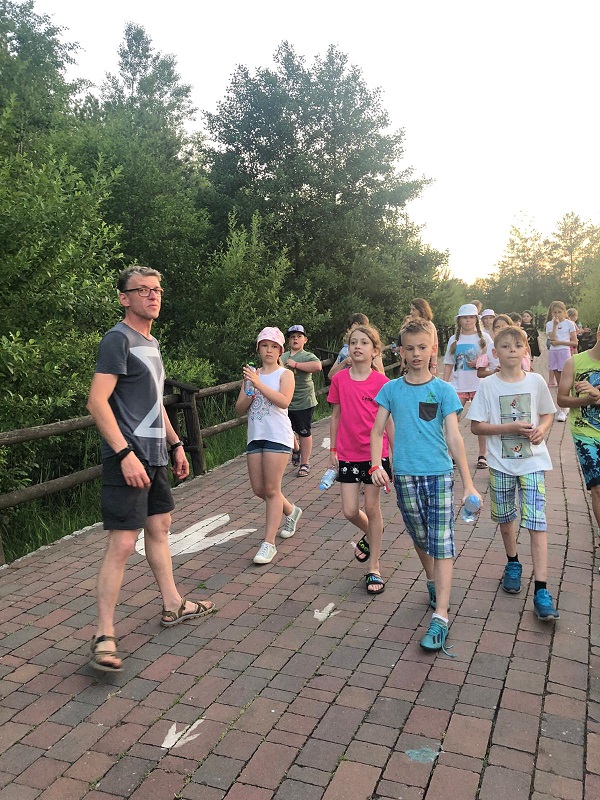 Po godzinie 20.00 dzieci pożegnały się z rodzicami i udały się na wieczorny spacer po JuraParku. Podczas zwiedzania uczniowie poznali wiele ciekawostek o ogromnych gadach i zadawali przewodnikowi wiele pytań. Opiekunowie przekonani, że dzieci zmęczone po całym dniu wrażeń szybko zasną, trochę się rozczarowali. Jednak noc minęła spokojnie.