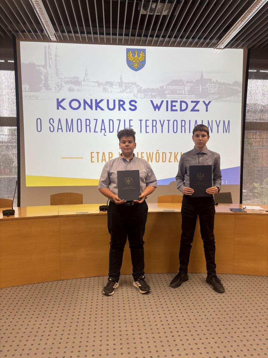 W Urzędzie Marszałkowskim Województwa Opolskiego odbył się etap wojewódzki Konkursu Wiedzy o Samorządzie Terytorialnym, w którym udział wzięli uczniowie naszej szkoły: Tomasz Filipek z klasy 7C oraz Jan Niewiadomski z klasy 8B, którzy mieli okazję sprawdzić swoją wiedzę na temat funkcjonowania władz lokalnych i regionalnych. Reprezentując szkołę na szczeblu wojewódzkim, wykazali się rzetelnym przygotowaniem, zaangażowaniem i godną pochwały postawą obywatelską. Gratulujemy im udziału i życzymy dalszych sukcesów!