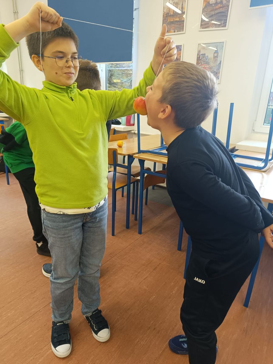 Na długiej przerwie uczniowie bawili się wspólnie, tańcząc do rytmów znanej piosenki „Macarena”. Dzieci chętnie naśladowały ruchy starszych kolegów i koleżanek, dzięki którym zabawa była jeszcze bardziej udana.