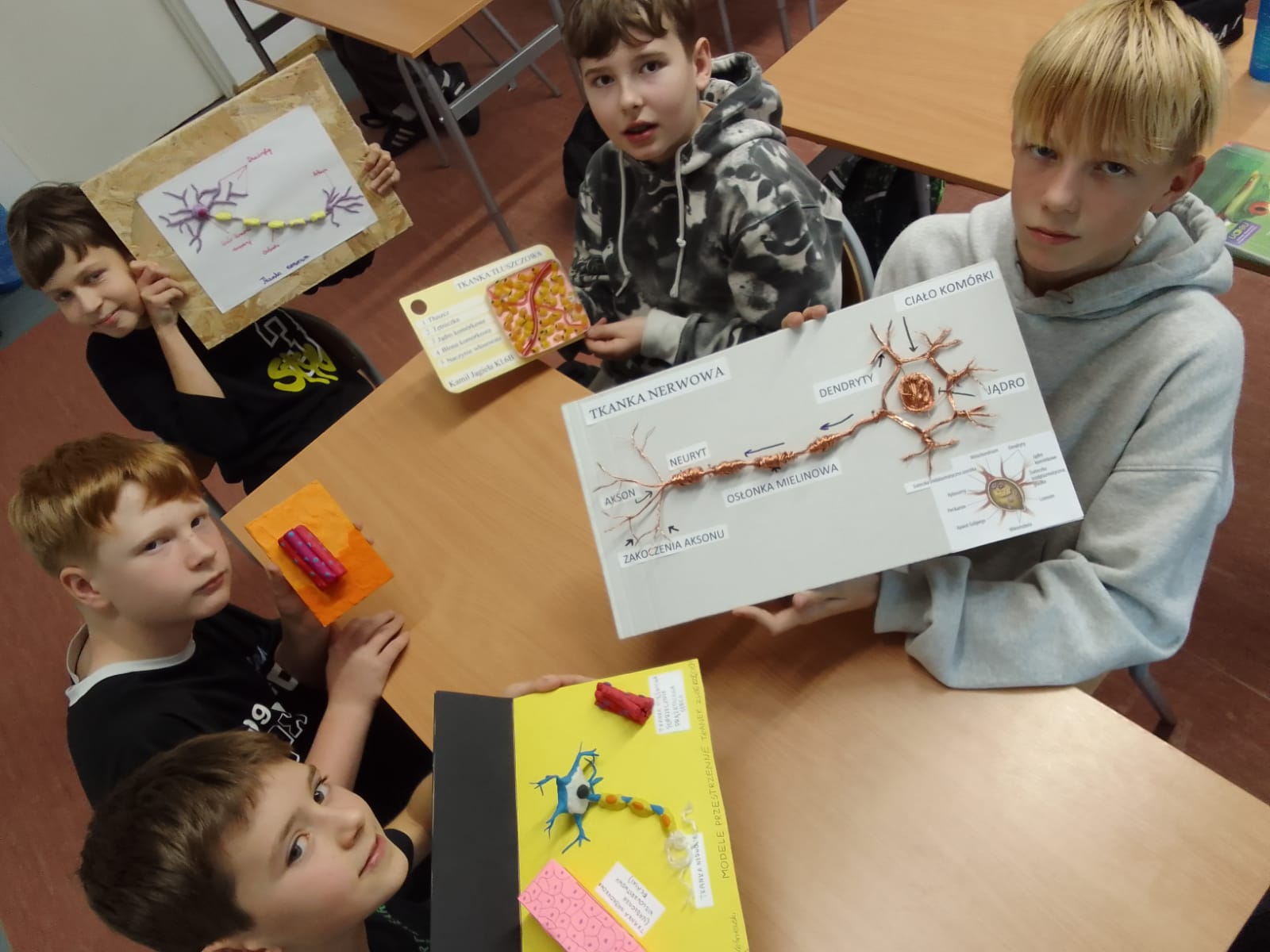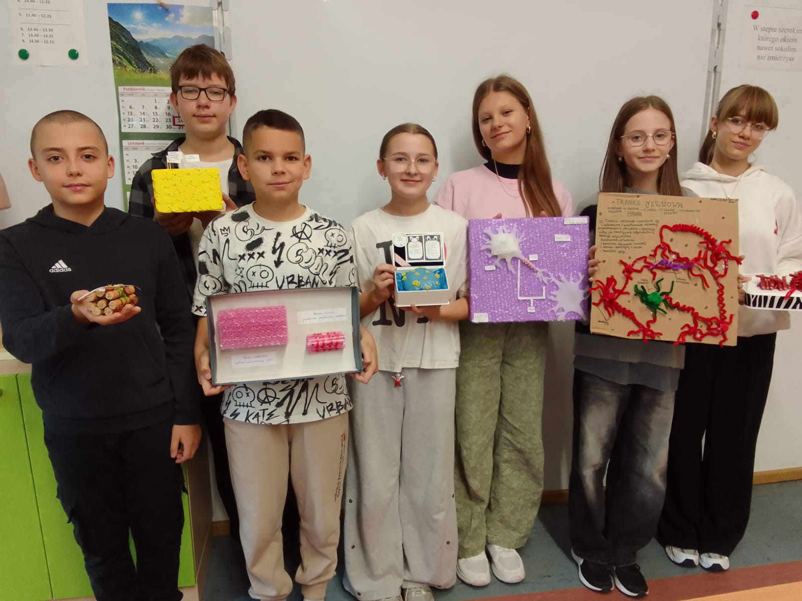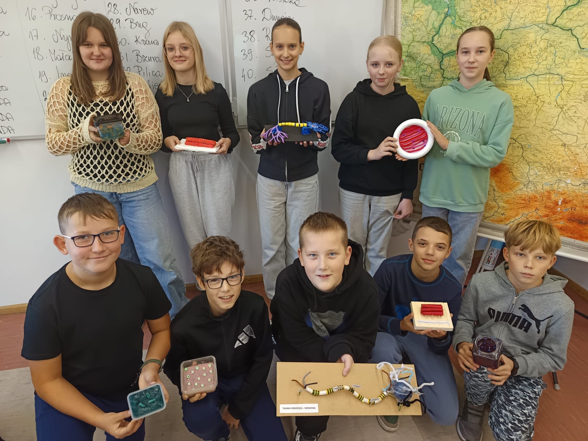 Uczniowie klas 6a, 6b i 6c wzięli udział w ciekawym projekcie biologicznym zatytułowanym „Tkanki zwierzęce”, którego celem było poznanie budowy i funkcji tkanek zwierzęcych w sposób praktyczny i angażujący. Pod kierunkiem nauczycielek biologii – pani Anny Zawiei oraz pani Małgorzaty Szury – uczniowie przygotowali przestrzenne modele różnych tkanek, wykorzystując do tego materiały plastyczne, elementy recyklingowe, a nawet produkty spożywcze!