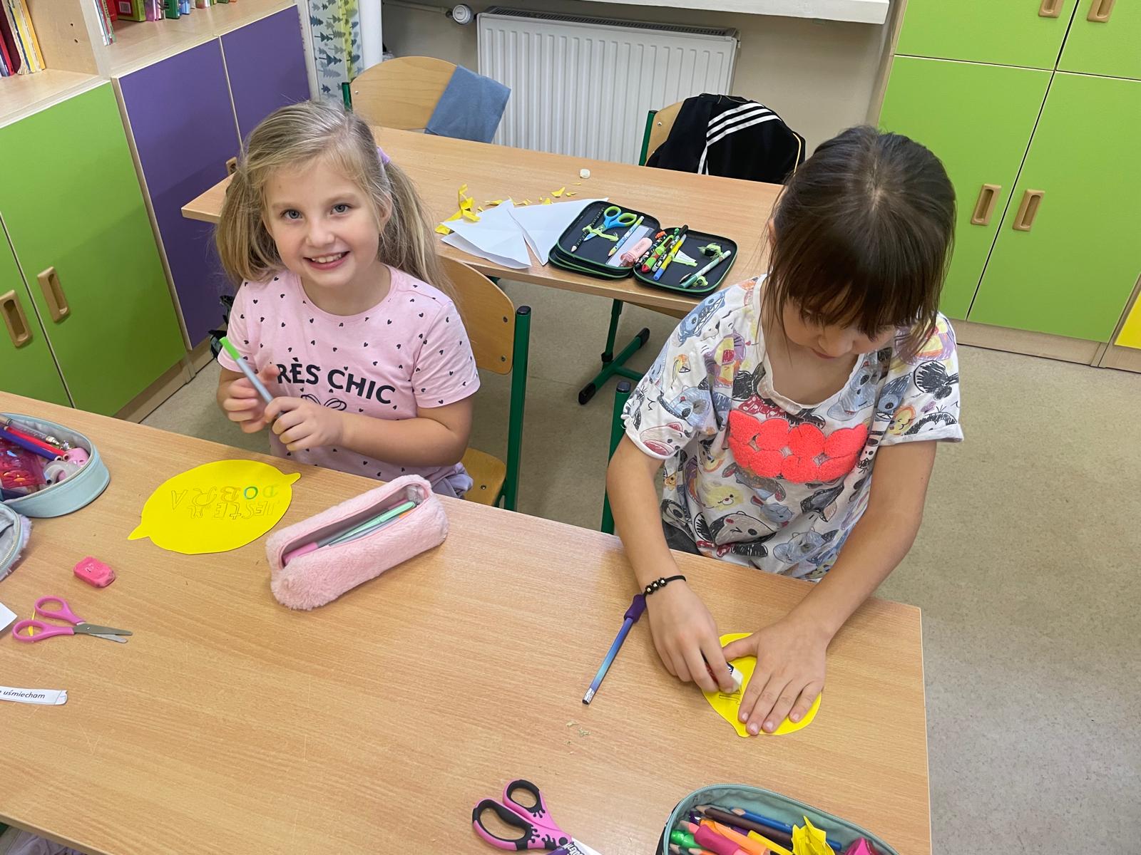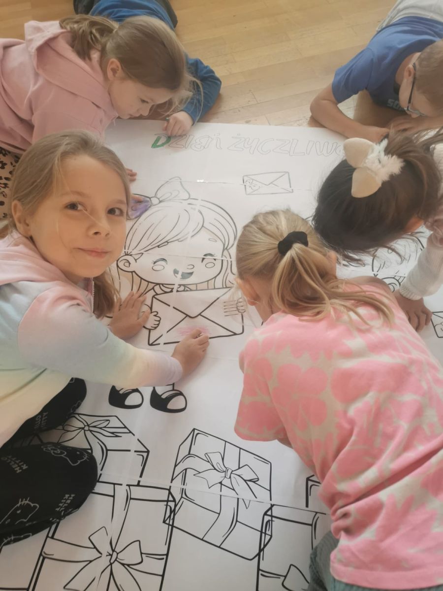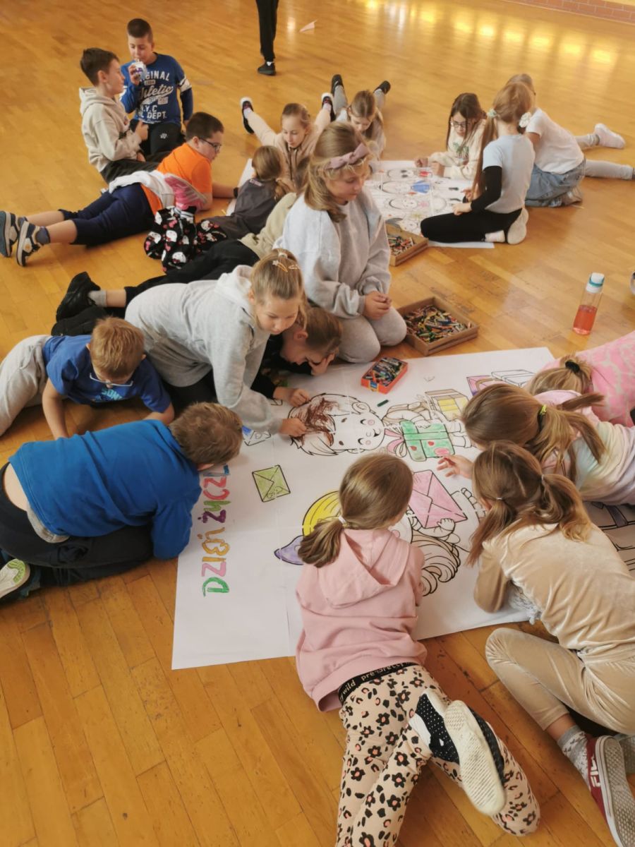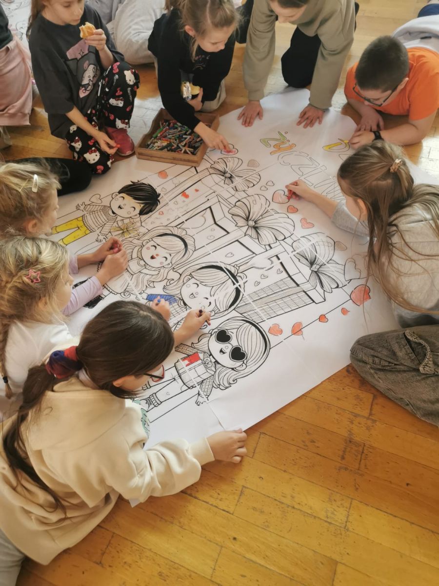 Kolorowanie i praca nad plakatami były okazją do rozmów o tym, jak być dla siebie miłym, jak reagować, gdy ktoś potrzebuje wsparcia, i jak drobne gesty zmieniają atmosferę w klasie.
