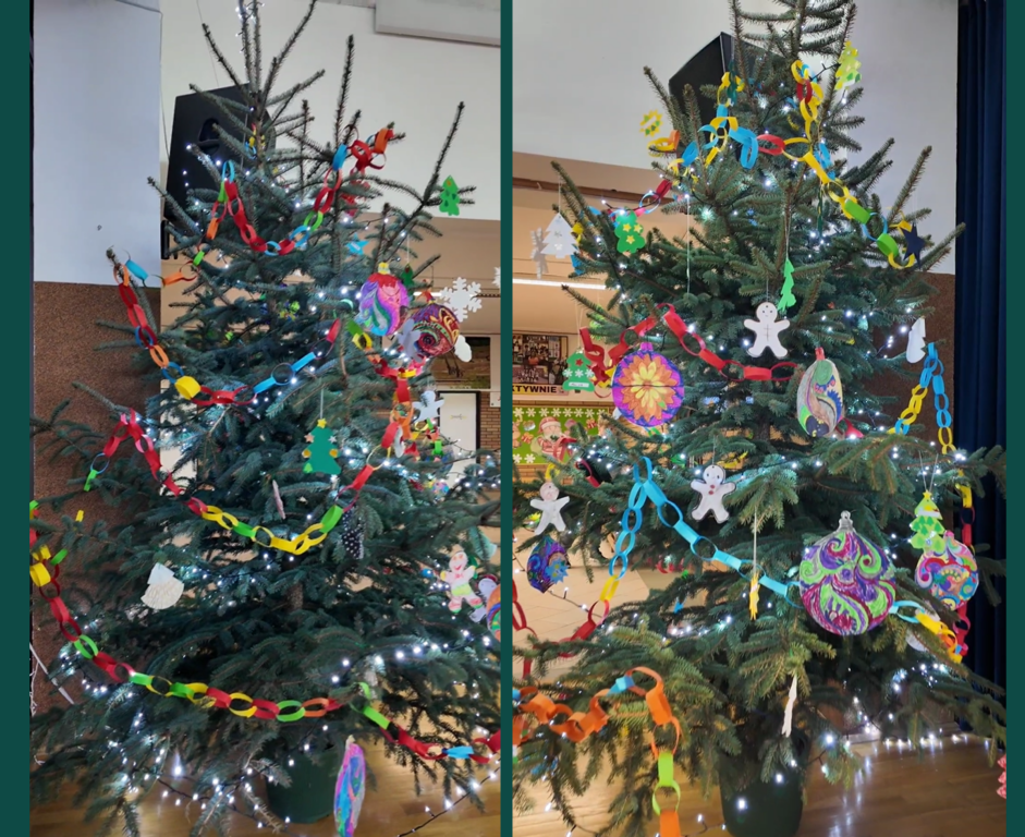 Drzewka zostały ozdobione przez uczniów klas 1–3 wraz ze swoimi Wychowawczyniami, którzy z ogromnym zaangażowaniem przygotowali świąteczne ozdoby i stworzyli z dziećmi prawdziwie radosną, twórczą atmosferę. Dziękujemy Nauczycielom edukacji wczesnoszkolnej za pomysłowość, cierpliwość i serce włożone w przygotowanie dekoracji – efekt ich pracy zachwyca i buduje świąteczny nastrój w całej szkole.