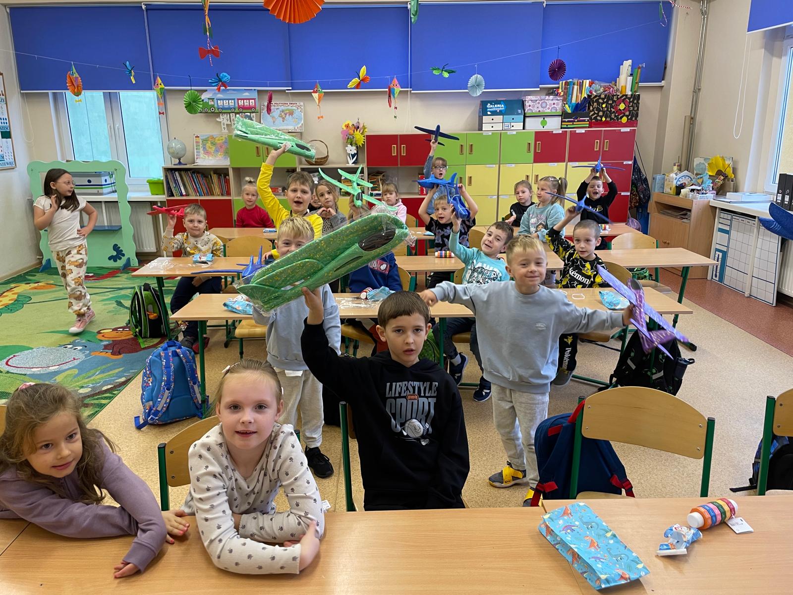 Uczniowie odkrywali, jakie cechy ma super chłopak, budowali papierowe samoloty, rozpoznawali marki znanych samochodów oraz brali udział w różnych grach i zabawach integracyjnych. W klasie 1B wielką frajdą okazały się wyścigi w workach, które dostarczyły mnóstwo emocji i śmiechu.
