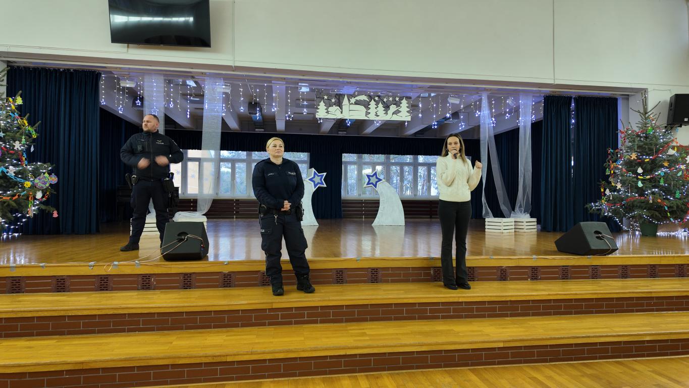 Podczas spotkania policjanci w przystępny i ciekawy sposób przypomnieli najmłodszym, jak bezpiecznie spędzać czas wolny w trakcie zimowego wypoczynku. Dzieci dowiedziały się, jak zachować ostrożność podczas zabaw na śniegu i lodzie, dlaczego nie wolno wchodzić na zamarznięte zbiorniki wodne oraz jak prawidłowo poruszać się po drogach, szczególnie w okresie zimowym. Funkcjonariusze zwrócili również uwagę na znaczenie noszenia elementów odblaskowych oraz właściwe zachowanie w kontaktach z nieznajomymi.
