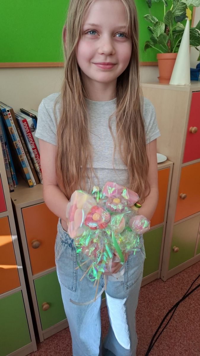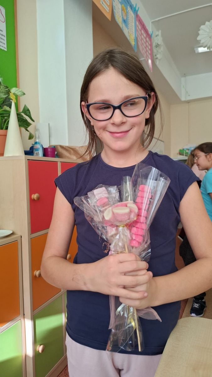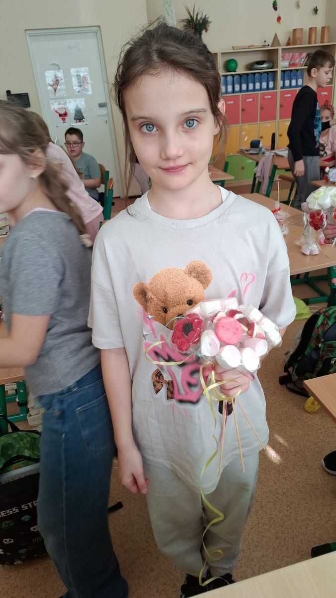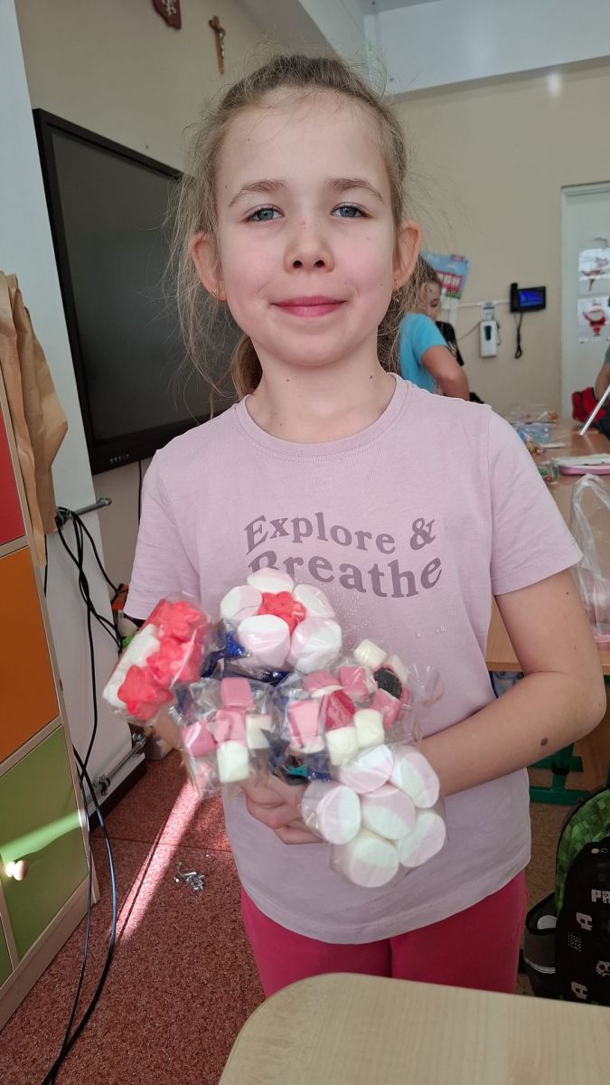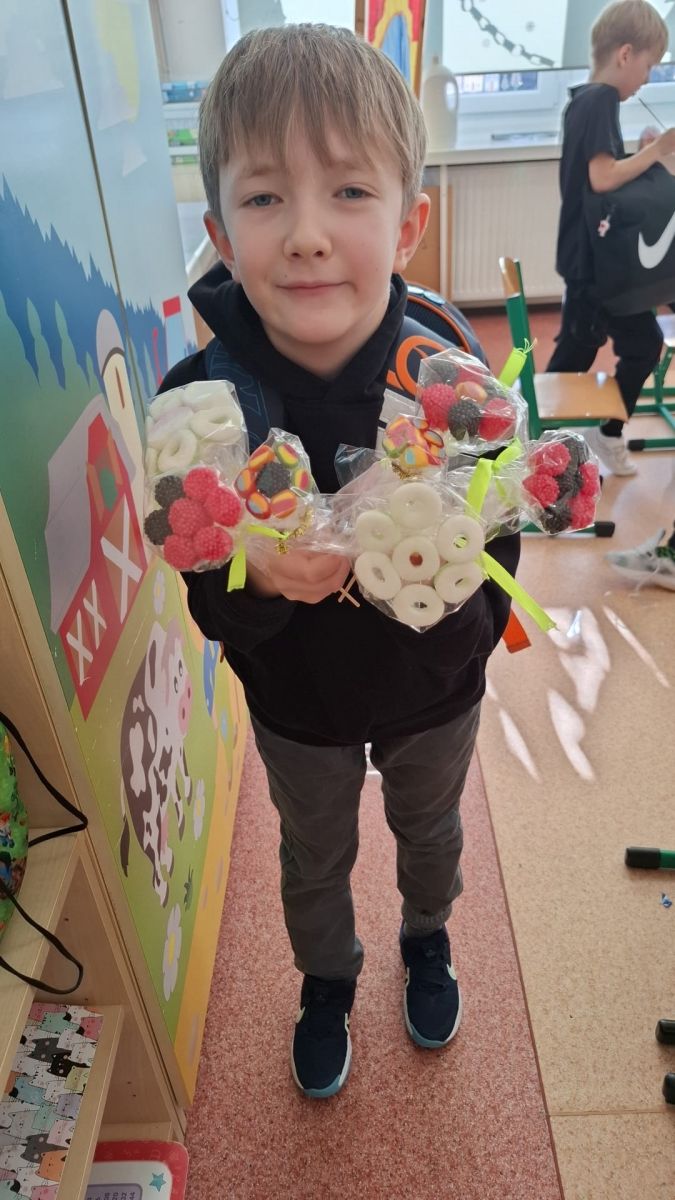Z okazji Dnia Babci i Dziadka uczniowie klasy 3a z ogromnym zaangażowaniem przygotowali wyjątkowe, słodkie bukieciki. Dzieci wykazały się kreatywnością i pomysłowością, tworząc kolorowe kompozycje z żelek oraz pianek, pełne radości, serca i dziecięcego uroku.