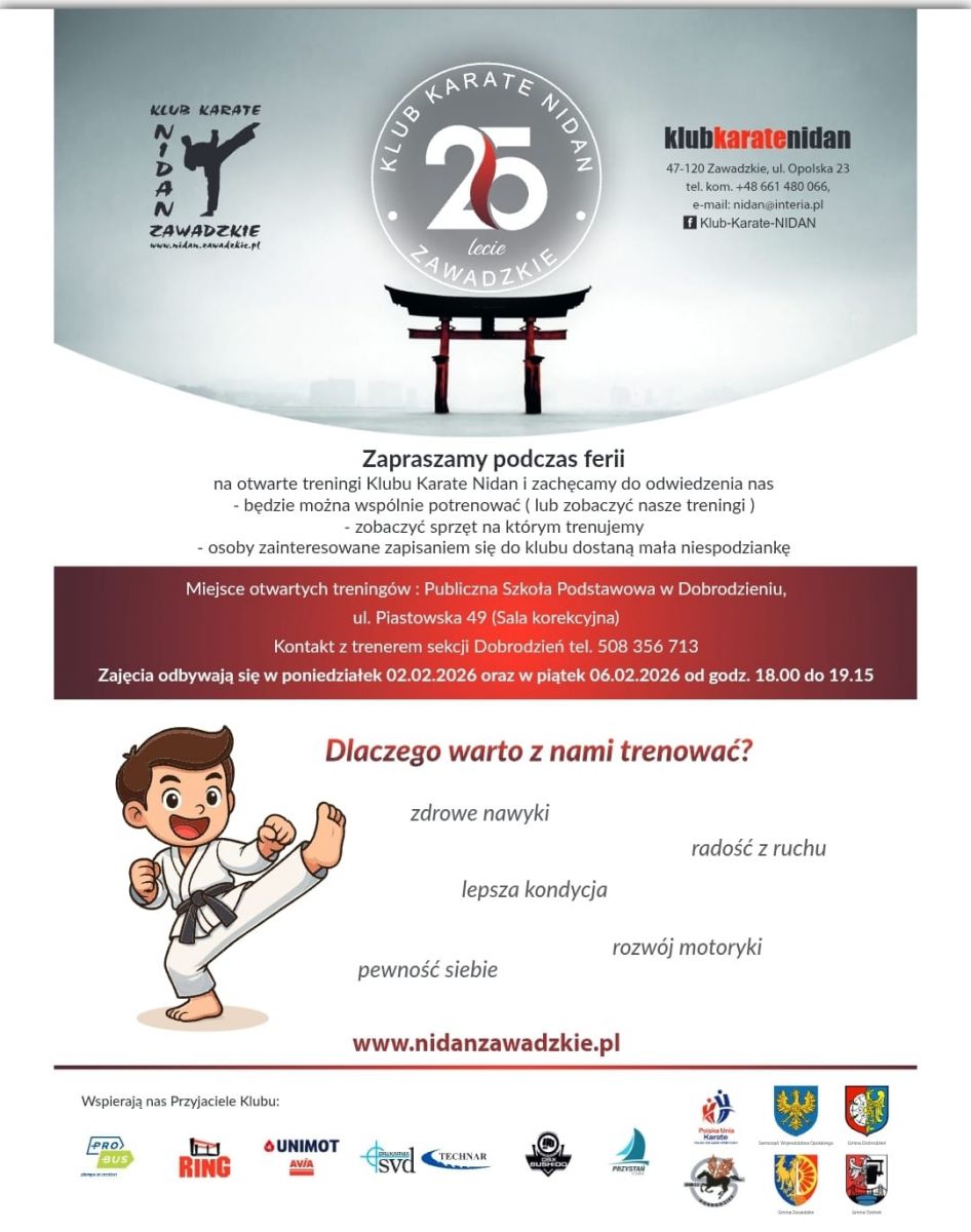 Podczas ferii zimowych w budynku naszej szkoły będzie się działo coś naprawdę fajnego! Sekcja karate zaprasza dzieci, młodzież i dorosłych na otwarte treningi, które odbędą się w Szkole Podstawowej nr 3 w Ozimku.