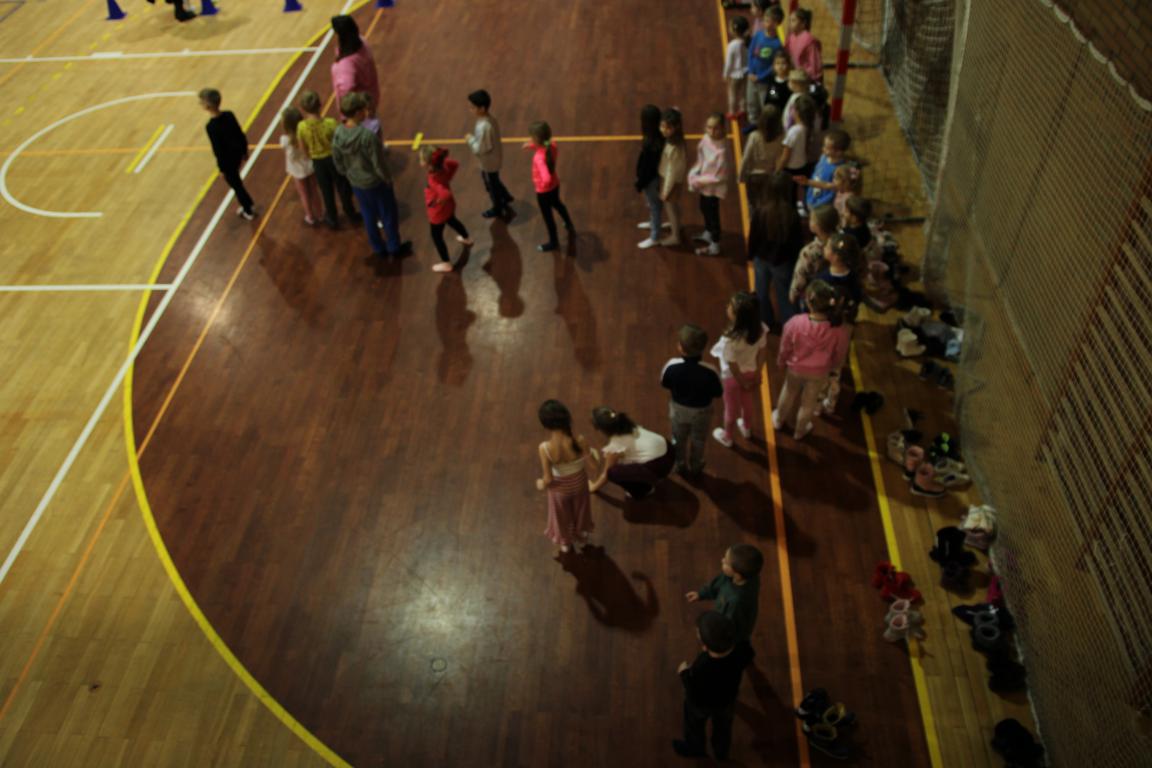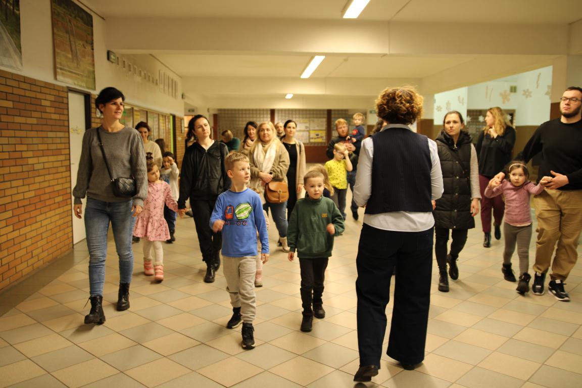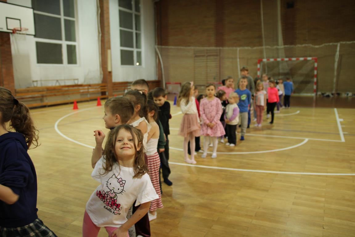 W tym czasie dzieci wzięły udział w zajęciach ruchowych na hali sportowej, prowadzonych przez Nauczycieli wychowania fizycznego – były skoki, mini-hokej, ćwiczenia równowagi na ławeczce oraz mnóstwo radosnej aktywności i śmiechu. Następnie goście zostali podzieleni na grupy szkolne i przedszkolne i wraz z nauczycielami wyruszyli na zwiedzanie szkoły. Odwiedzili m.in. sale lekcyjne, świetlicę szkolną, salę terapeutyczną, bibliotekę, stołówkę oraz oddział przedszkolny.