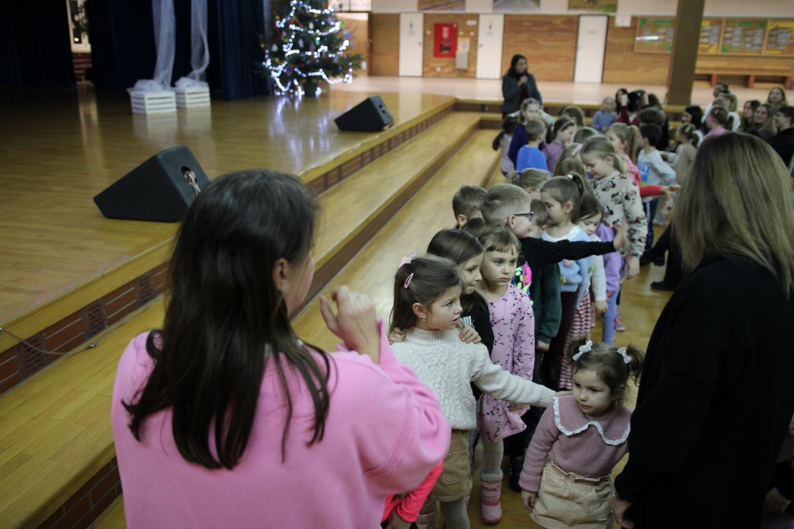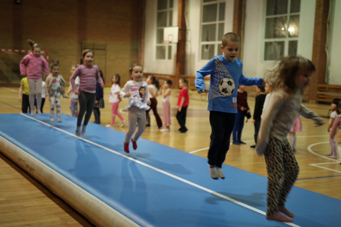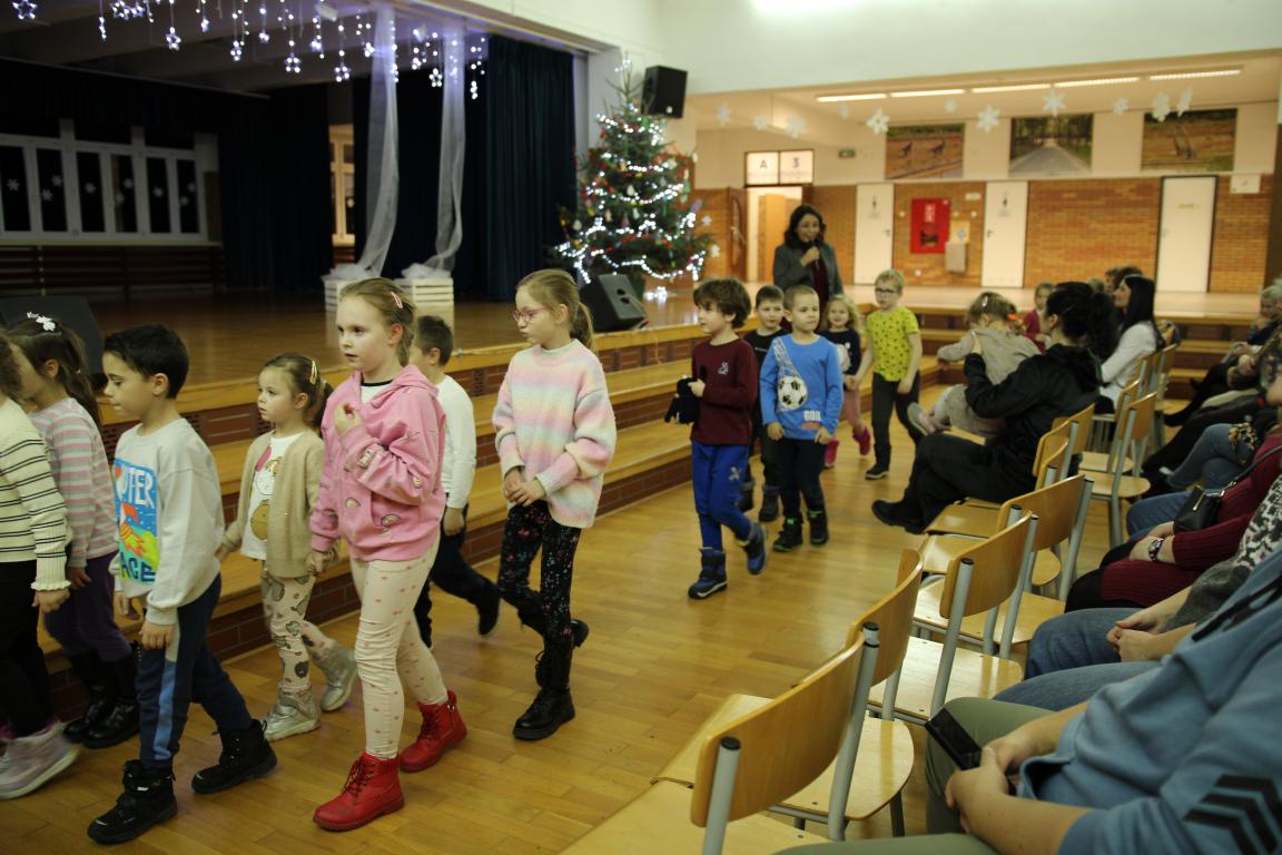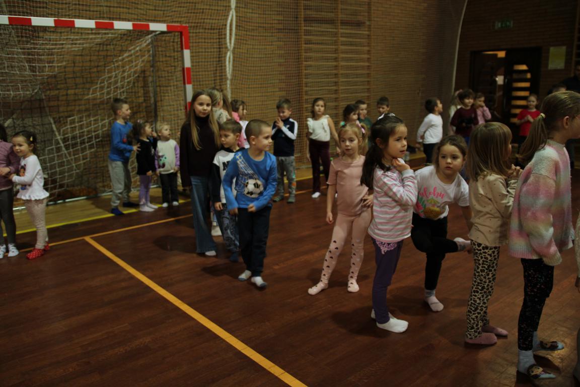 W tym czasie dzieci wzięły udział w zajęciach ruchowych na hali sportowej, prowadzonych przez Nauczycieli wychowania fizycznego – były skoki, mini-hokej, ćwiczenia równowagi na ławeczce oraz mnóstwo radosnej aktywności i śmiechu. Następnie goście zostali podzieleni na grupy szkolne i przedszkolne i wraz z nauczycielami wyruszyli na zwiedzanie szkoły. Odwiedzili m.in. sale lekcyjne, świetlicę szkolną, salę terapeutyczną, bibliotekę, stołówkę oraz oddział przedszkolny.