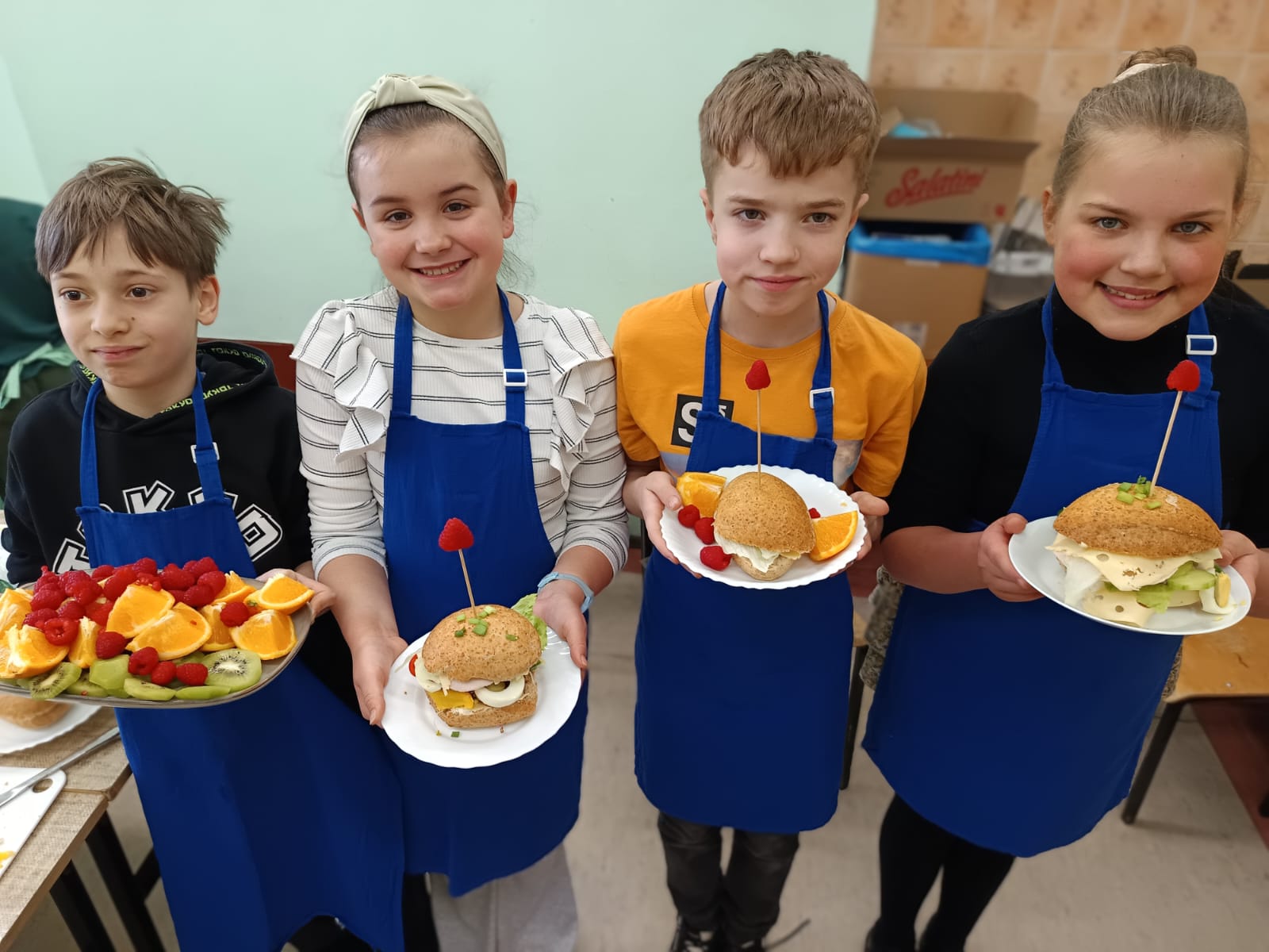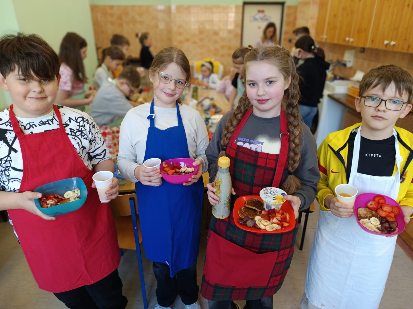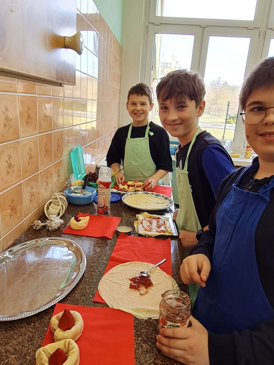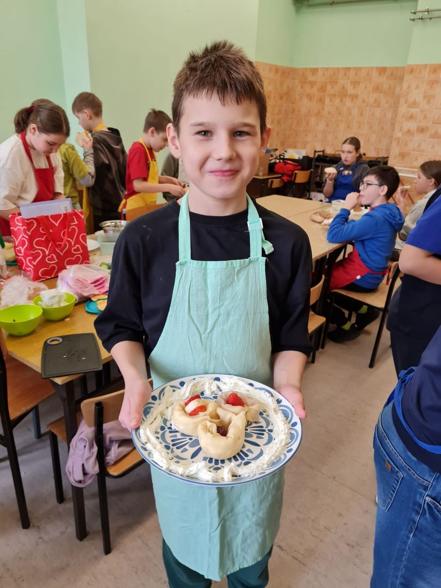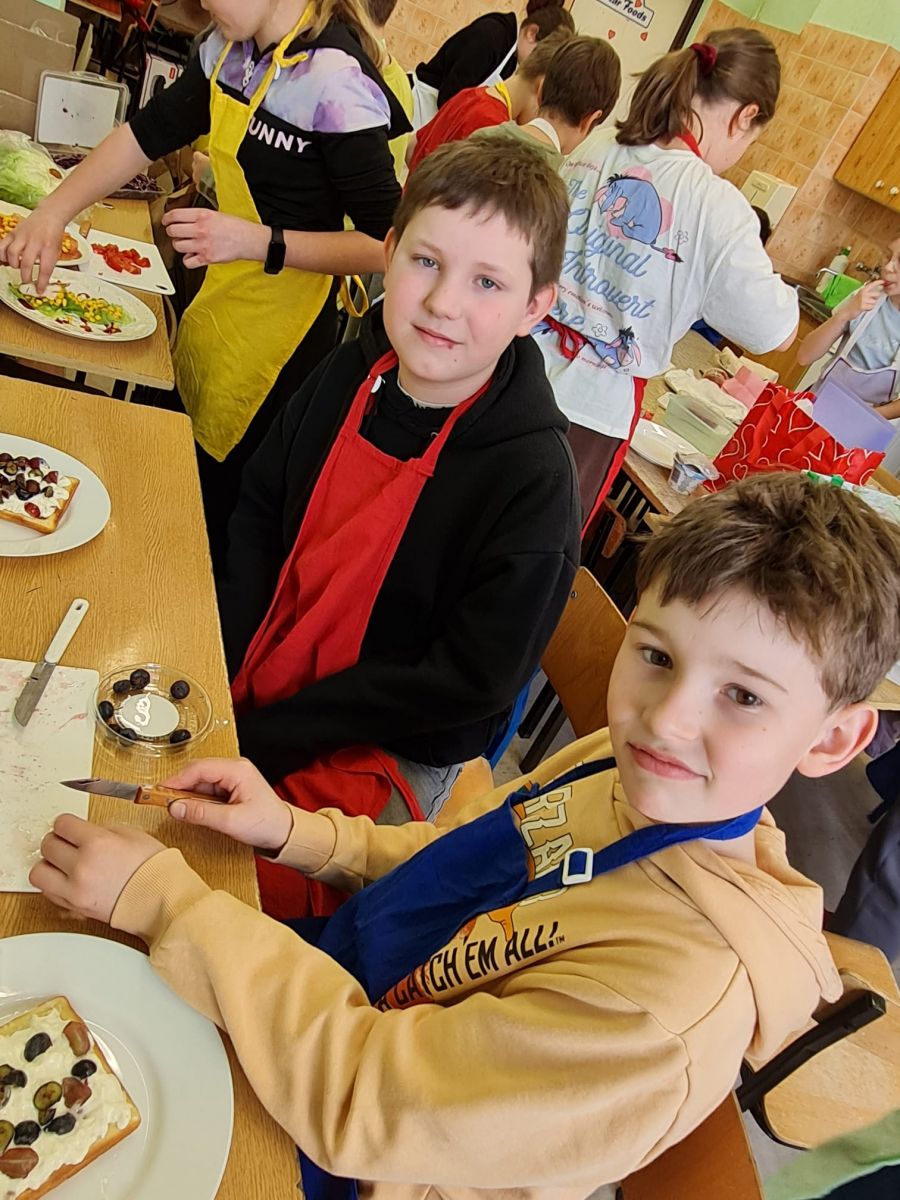 Dodatkowym wyzwaniem była praca zespołowa. Wspólne przygotowanie potraw wymagało dobrej komunikacji, podziału obowiązków oraz umiejętności współpracy. Czwartoklasiści świetnie poradzili sobie z tym zadaniem – z dużym zaangażowaniem przygotowali różnorodne i smaczne propozycje zdrowych przekąsek, które później z przyjemnością skosztowali.