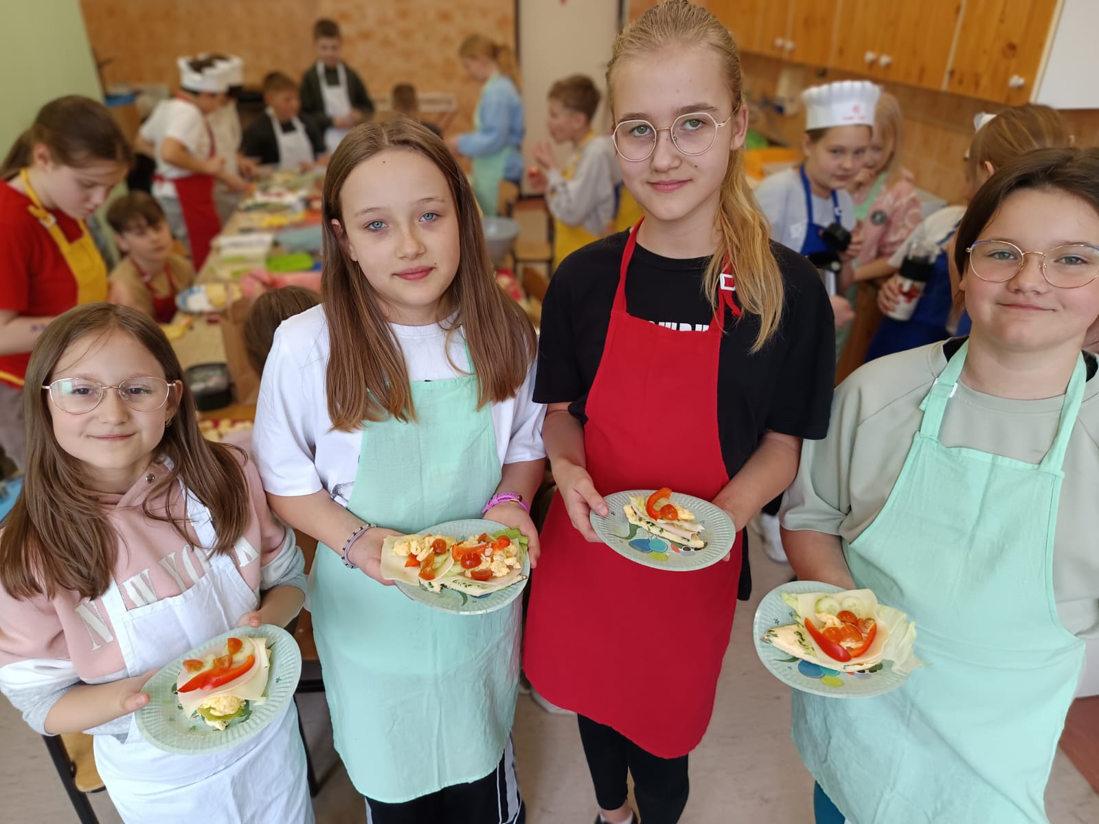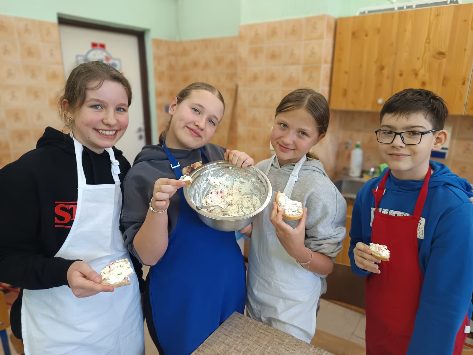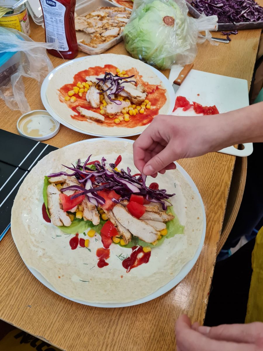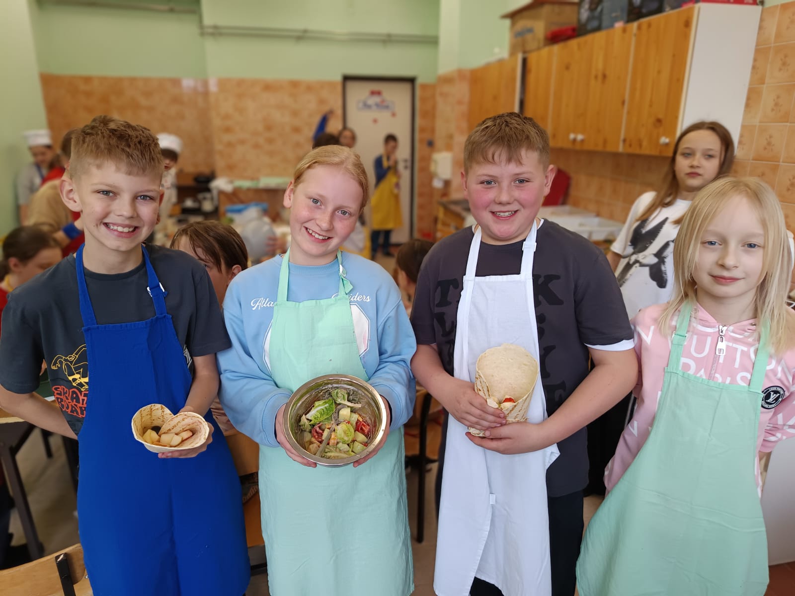 Dodatkowym wyzwaniem była praca zespołowa. Wspólne przygotowanie potraw wymagało dobrej komunikacji, podziału obowiązków oraz umiejętności współpracy. Czwartoklasiści świetnie poradzili sobie z tym zadaniem – z dużym zaangażowaniem przygotowali różnorodne i smaczne propozycje zdrowych przekąsek, które później z przyjemnością skosztowali.