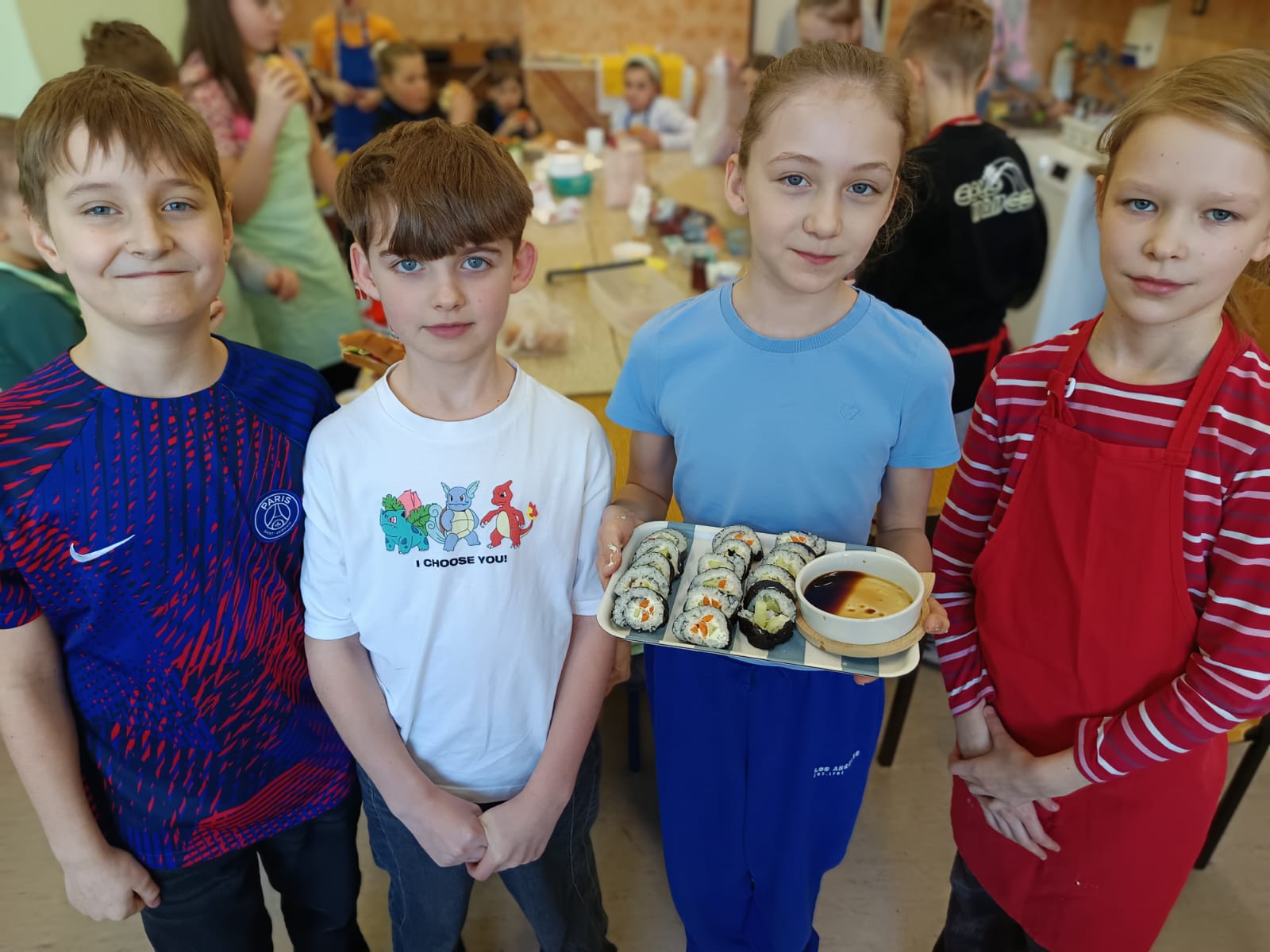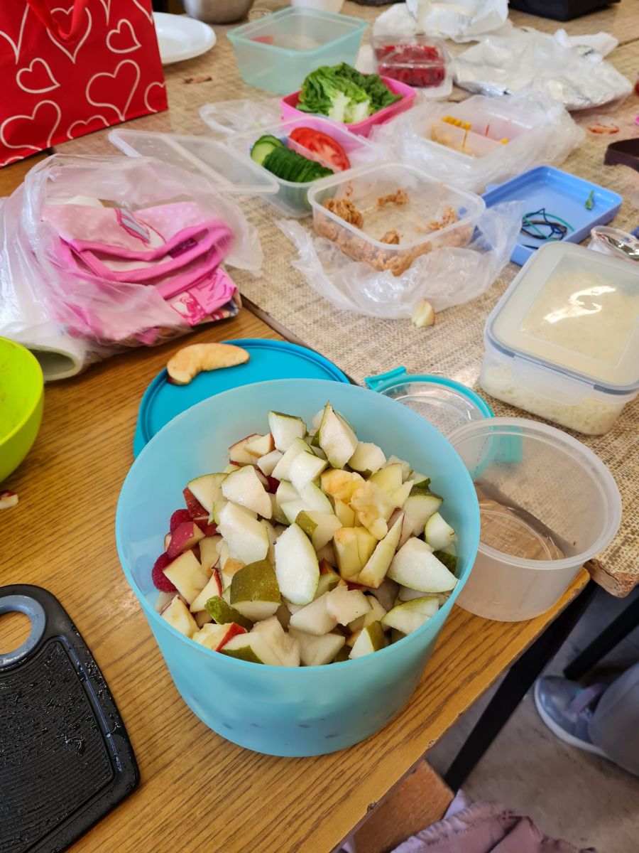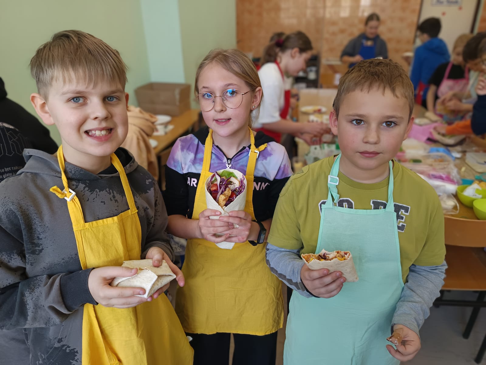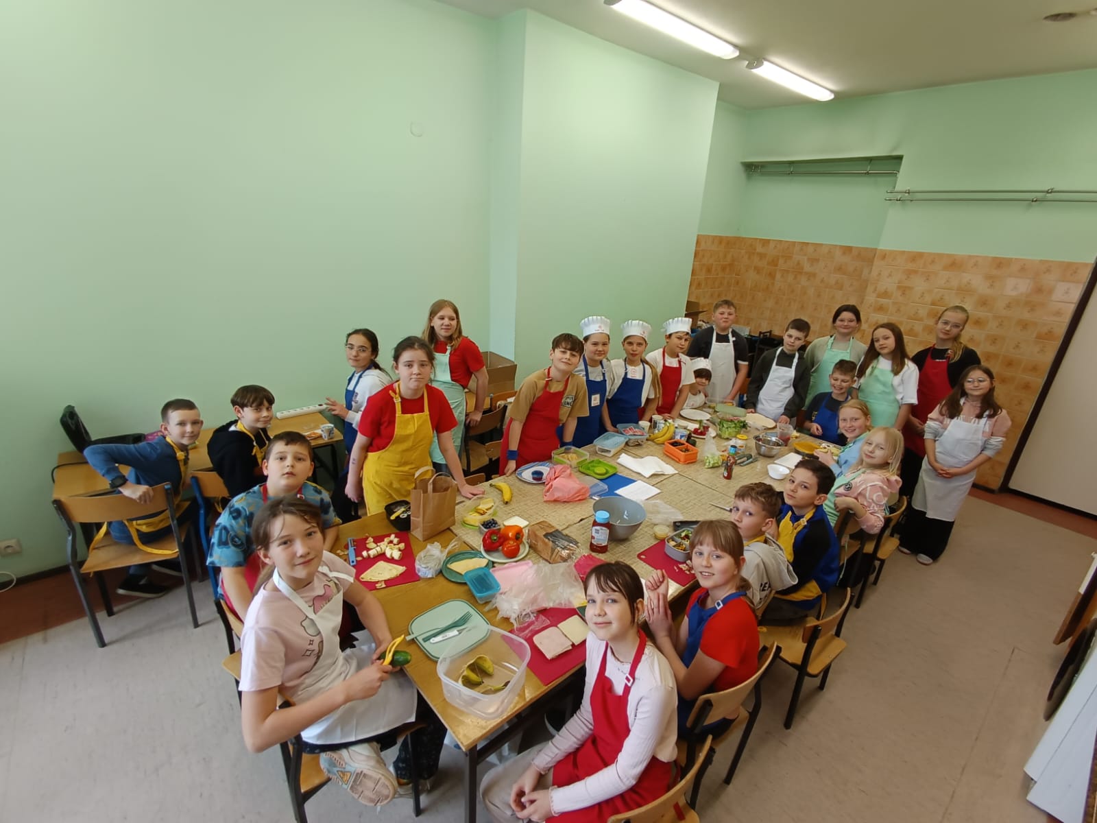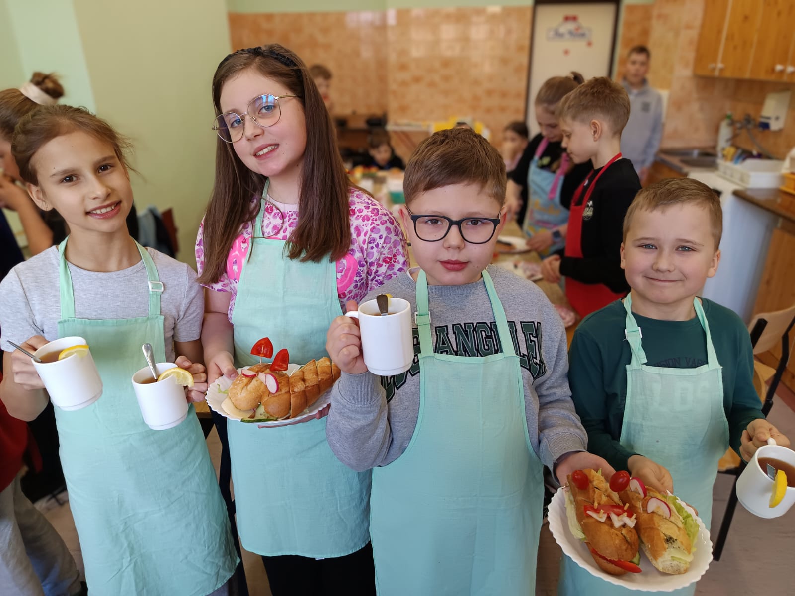 Dodatkowym wyzwaniem była praca zespołowa. Wspólne przygotowanie potraw wymagało dobrej komunikacji, podziału obowiązków oraz umiejętności współpracy. Czwartoklasiści świetnie poradzili sobie z tym zadaniem – z dużym zaangażowaniem przygotowali różnorodne i smaczne propozycje zdrowych przekąsek, które później z przyjemnością skosztowali.