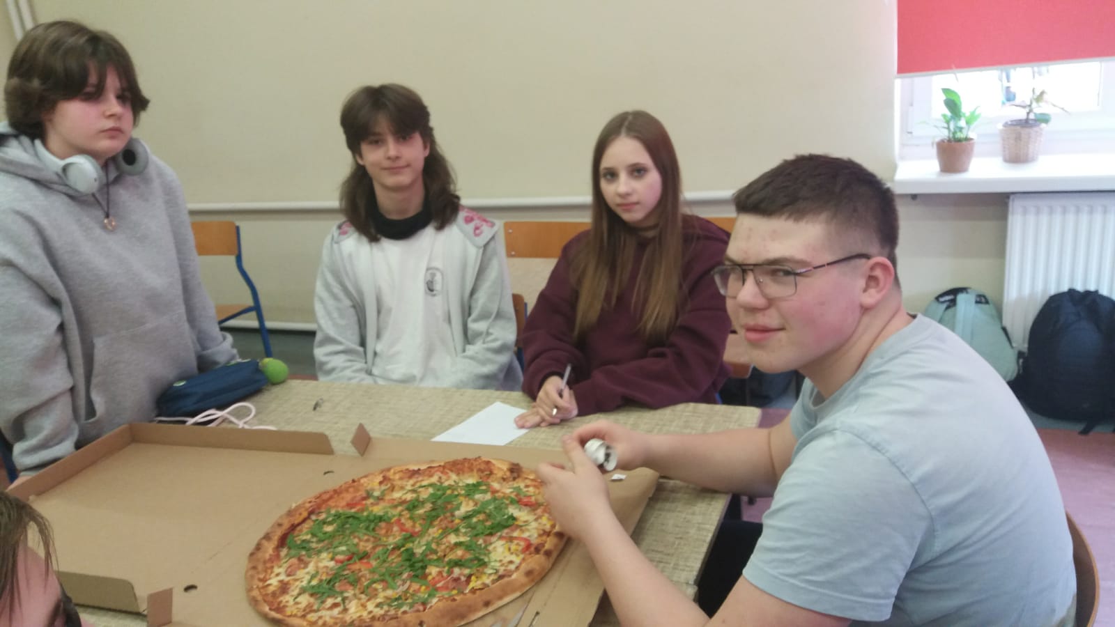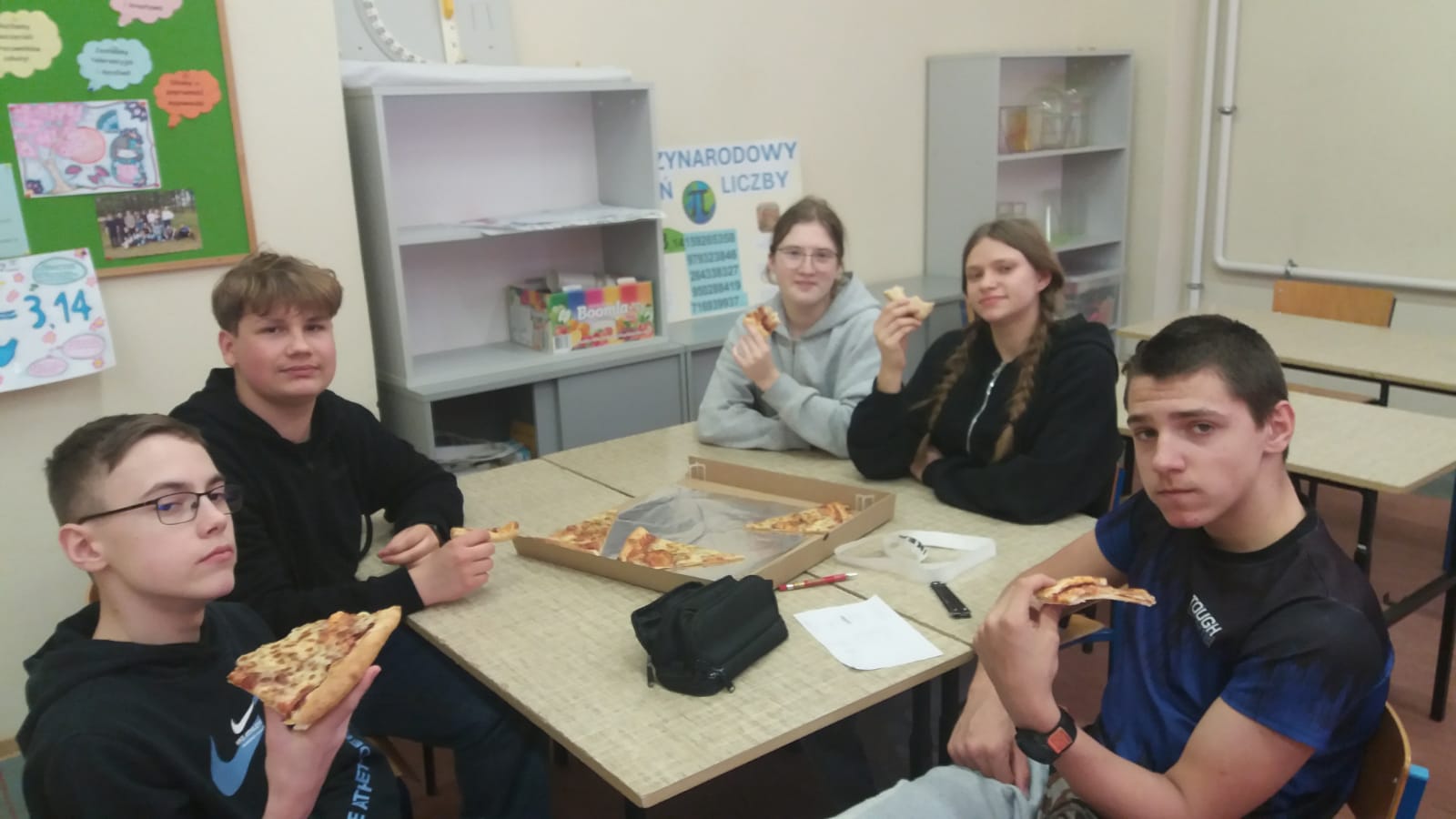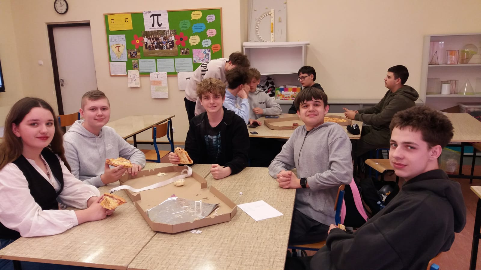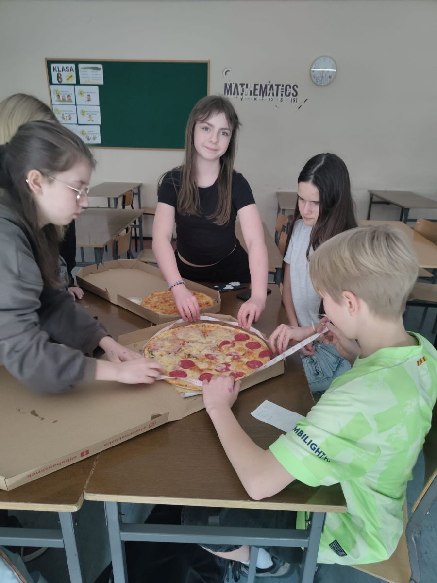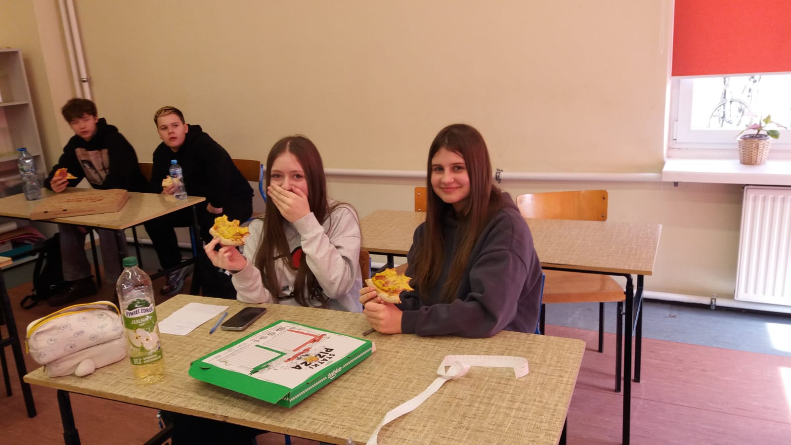 Na lekcjach w klasach 7 i 8 królowała… pizza! Uczniowie mierzyli obwód i średnicę, a następnie samodzielnie obliczali wartość liczby π. Nie zabrakło też ciekawego matematycznego dylematu – jedna duża pizza czy dwie małe? Dzięki takim zadaniom uczniowie mogli przekonać się, że praktyczna matematyka smakuje najlepiej.