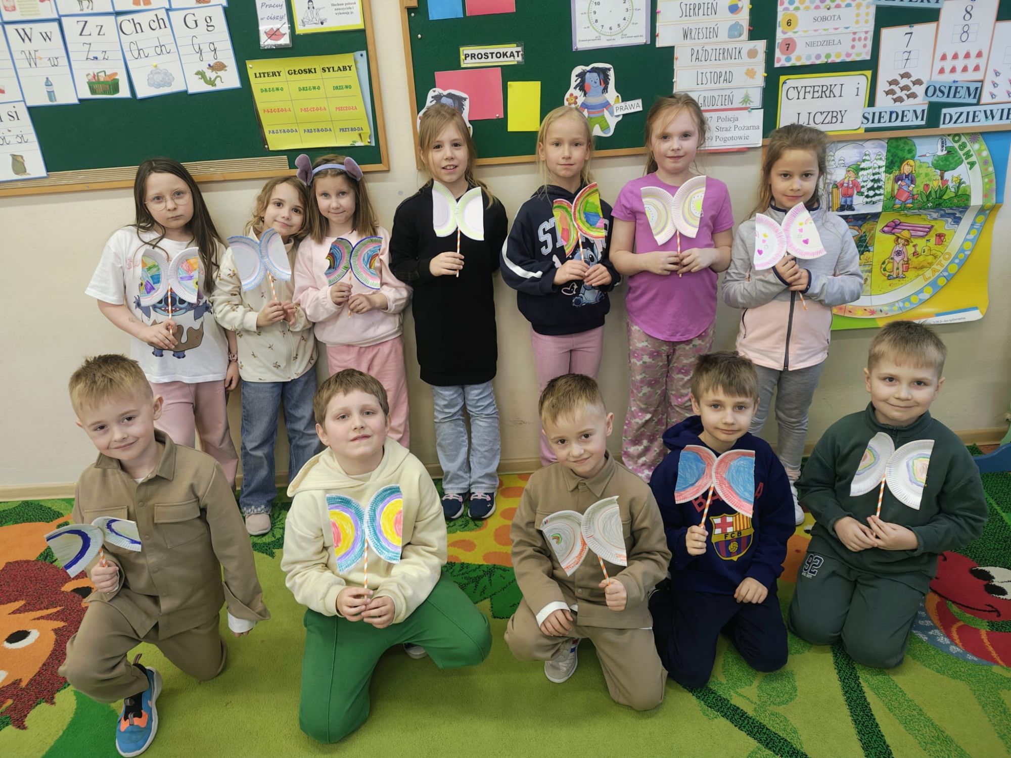 Na zakończenie zajęć uczniowie wykonali pracę plastyczną – kolorowego motyla z talerzyków papierowych i słomki. Była to doskonała okazja do utrwalenia poznanego słownictwa w praktyce oraz rozwijania sprawności manualnej. Powstałe prace były nie tylko piękne, ale także stanowiły wyraz dziecięcej kreatywności i zaangażowania.