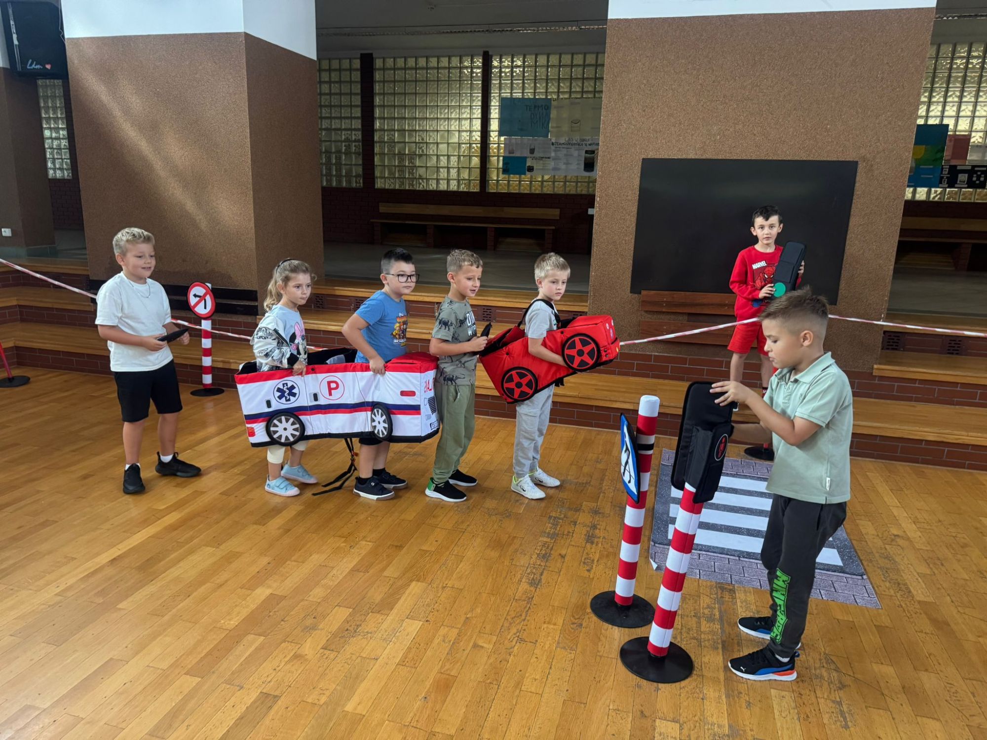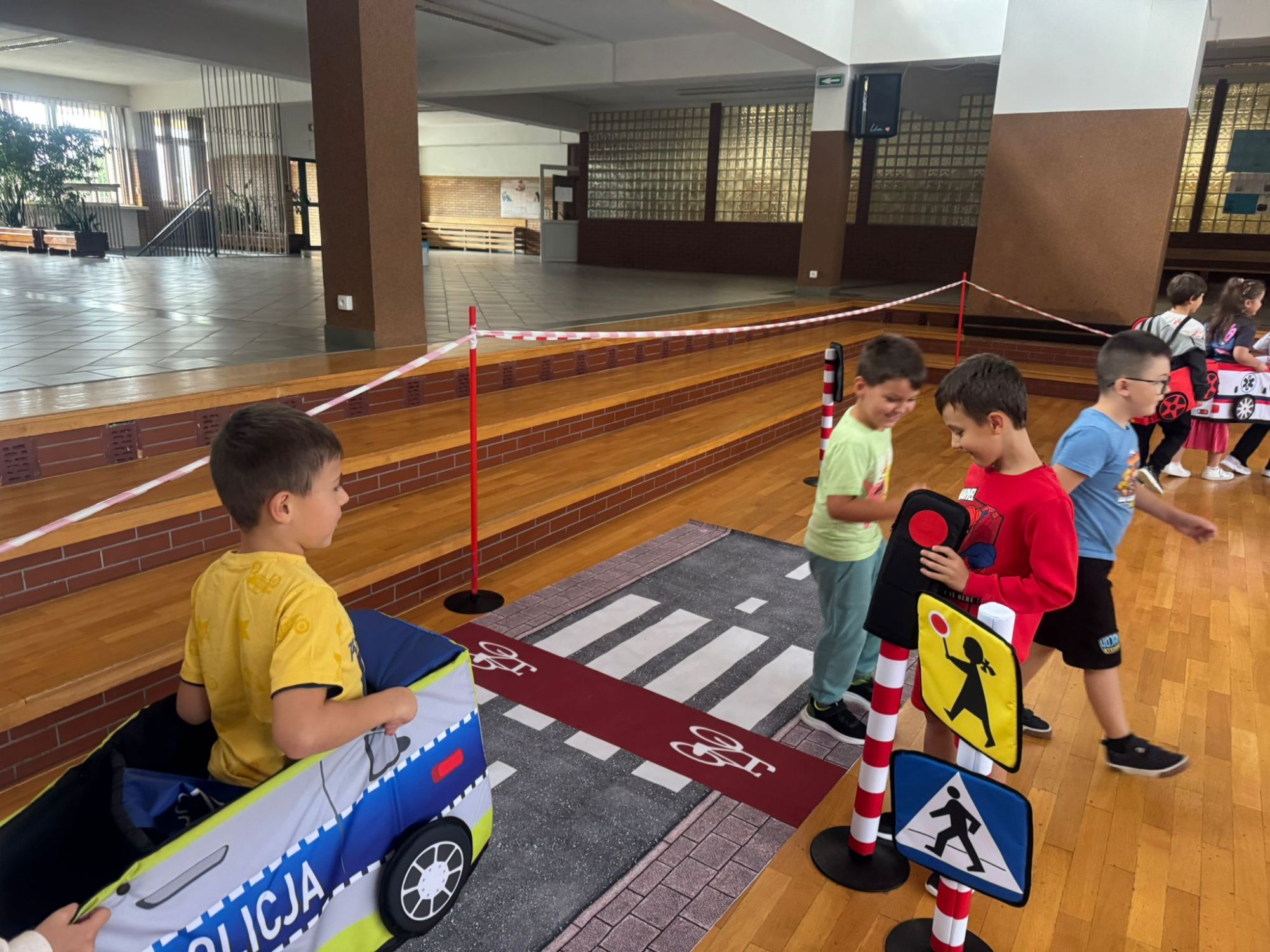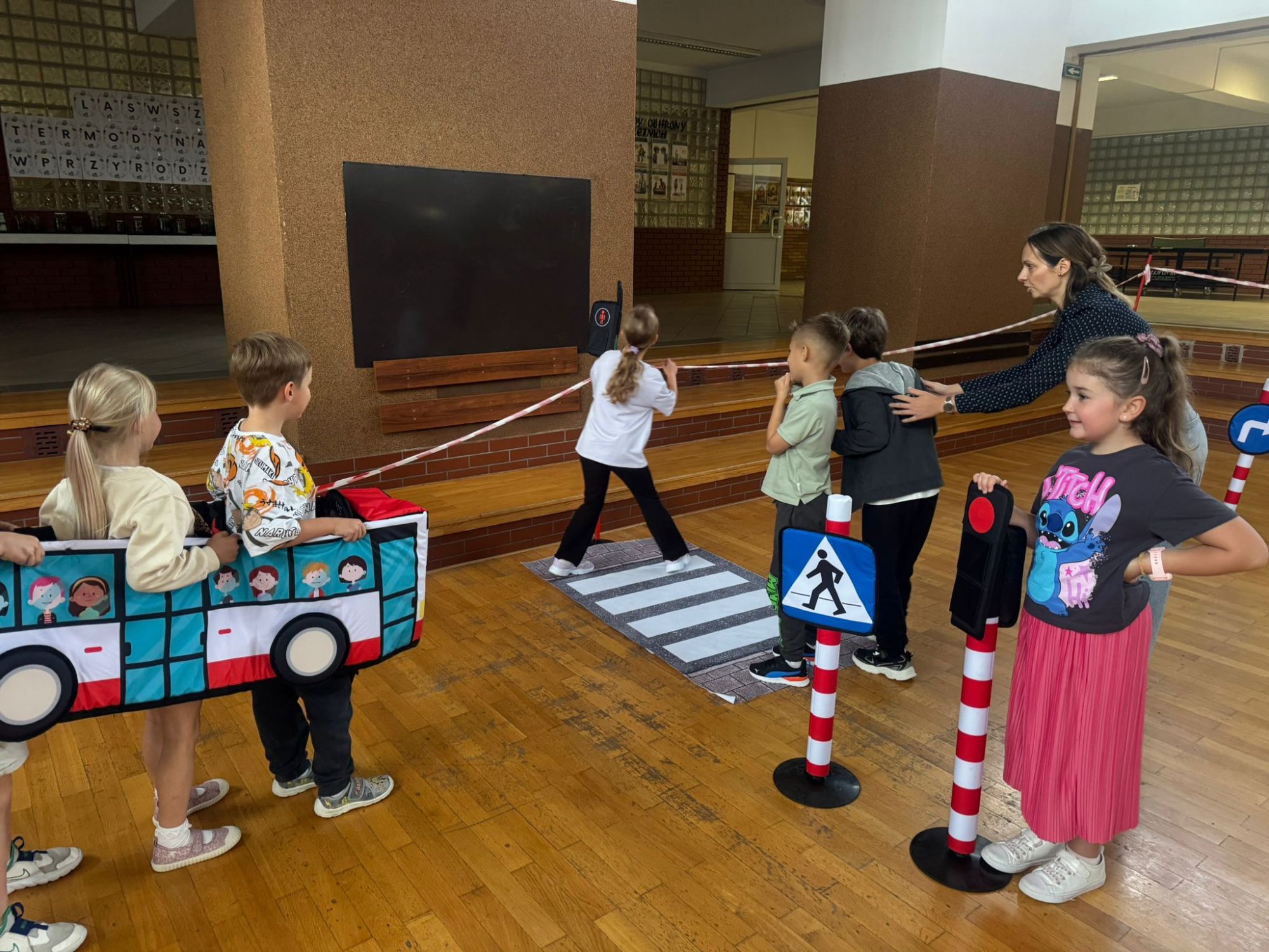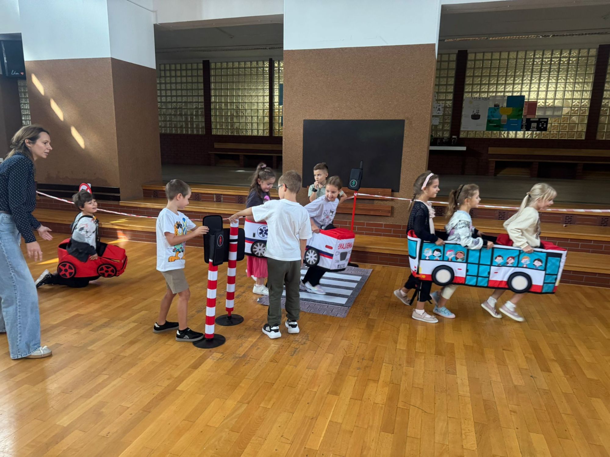W piątek w ramach Europejskiego Tygodnia Mobilności nasza aula szkolna zamieniła się w prawdziwe miasteczko ruchu drogowego. Dzieci mogły wcielić się w rolę pieszych, rowerzystów i pasażerów, ucząc się bezpiecznego poruszania się w praktyce – na torze z sygnalizacją świetlną, przejściami dla pieszych i znakami drogowymi.