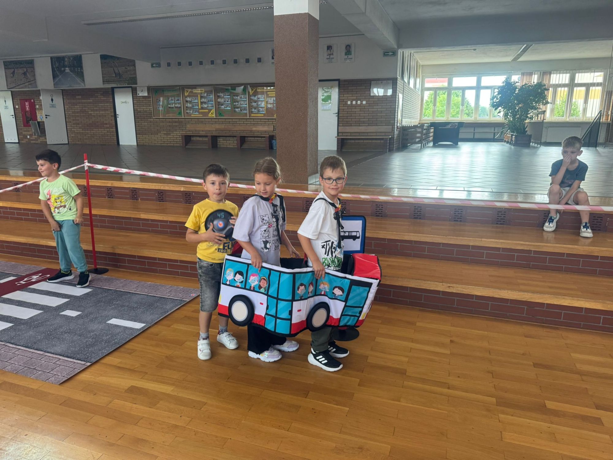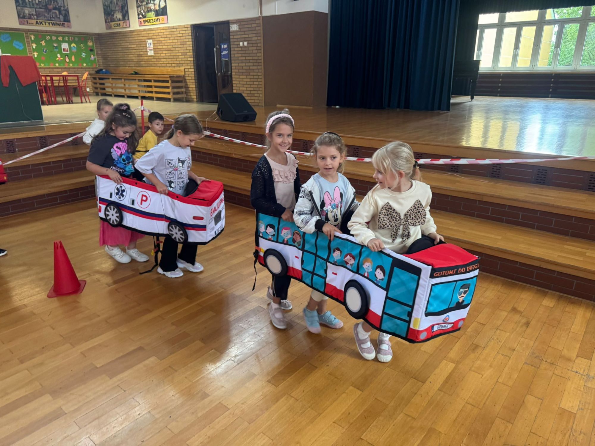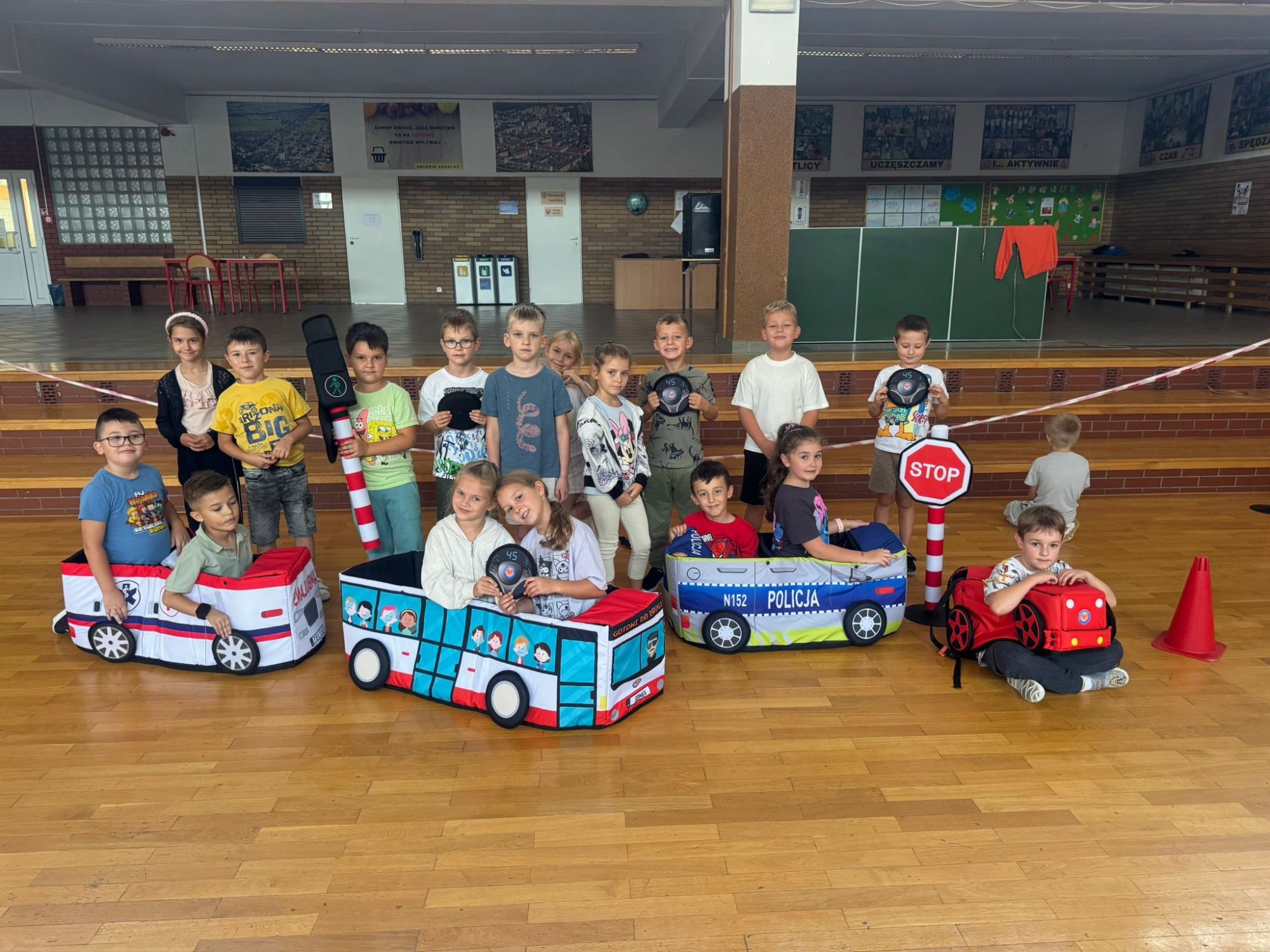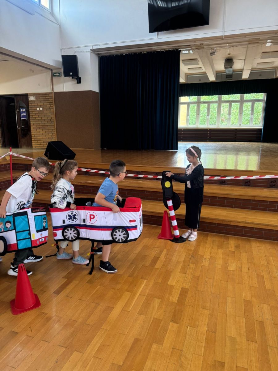 W piątek w ramach Europejskiego Tygodnia Mobilności nasza aula szkolna zamieniła się w prawdziwe miasteczko ruchu drogowego. Dzieci mogły wcielić się w rolę pieszych, rowerzystów i pasażerów, ucząc się bezpiecznego poruszania się w praktyce – na torze z sygnalizacją świetlną, przejściami dla pieszych i znakami drogowymi.