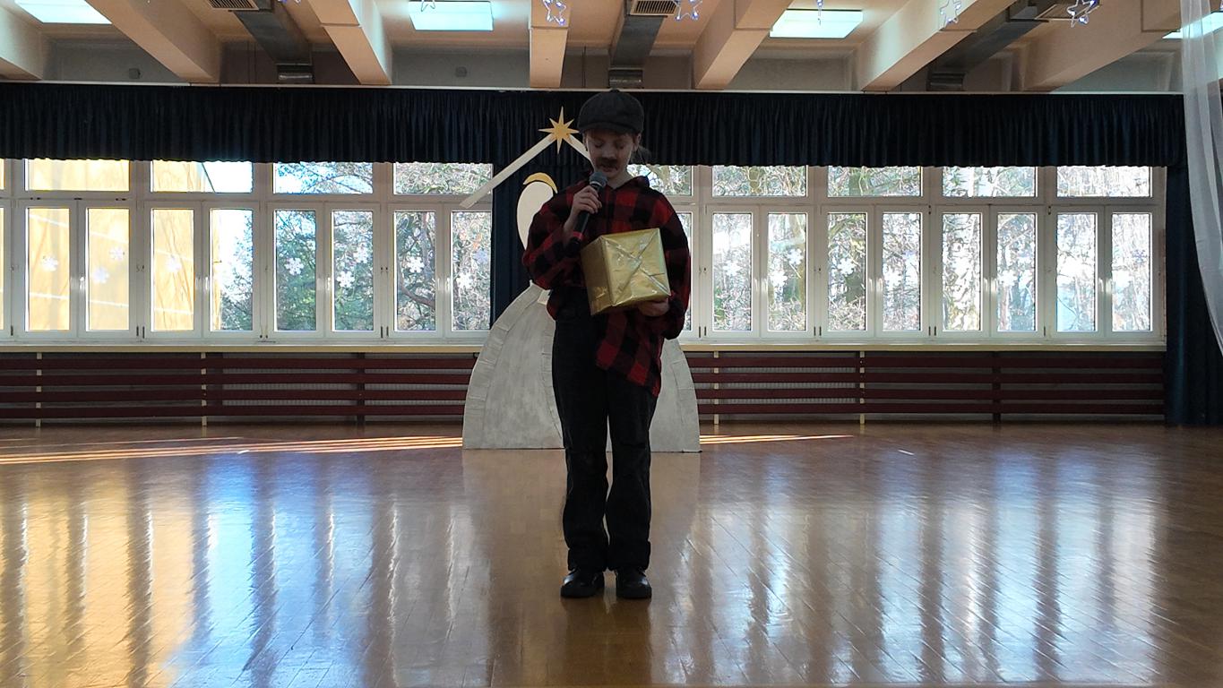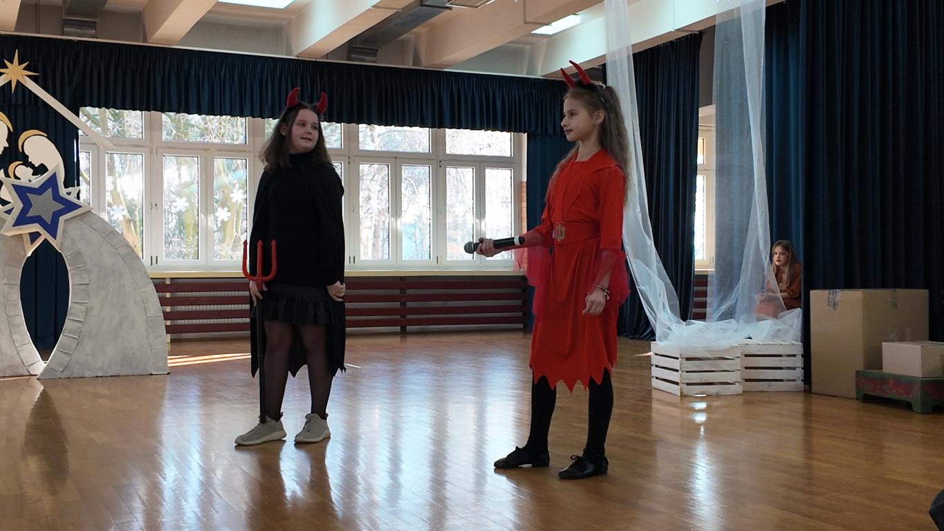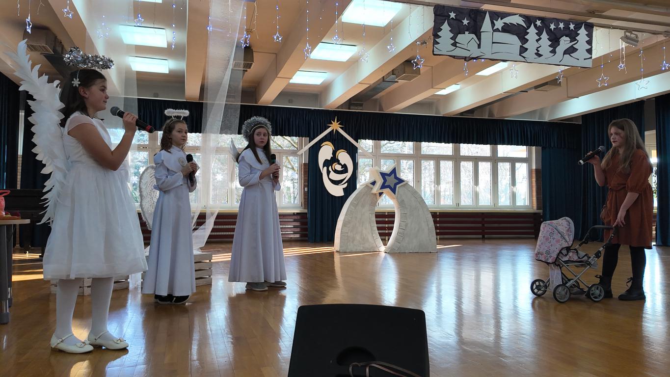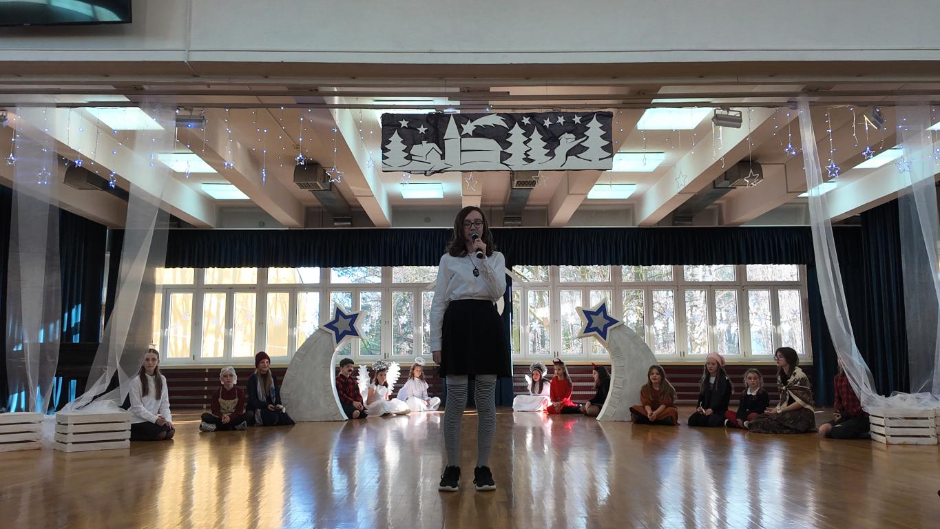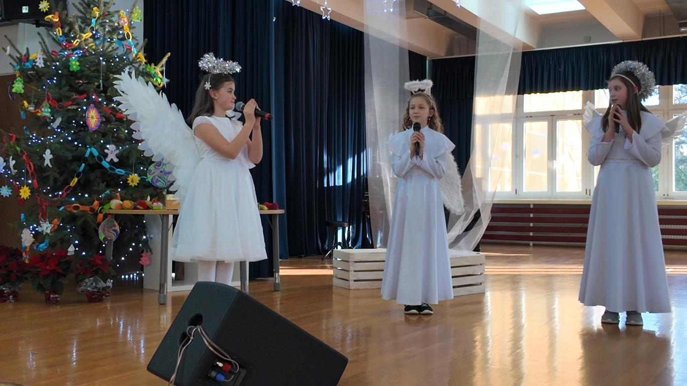 Podczas jasełek nie zabrakło pięknych występów artystycznych naszych uczniów. Były śpiewy, gra na skrzypcach, a całość dopełniał akompaniament Pani Karoliny Pawlik-Grajcar, która z wielką wrażliwością przygrywała na cyfrowym pianinie. Na zakończenie świąteczne życzenia w imieniu Samorządu Uczniowskiego złożył jego Przewodniczący Witold Szczemirski, który również wystąpił w przedstawieniu. Za profesjonalne nagłośnienie odpowiadał Pan Sylwester Dorynek, a mobilne, pomysłowe dekoracje przygotowała niezawodna Pani Barbara Zabawa, które Aniołki wykorzystywały podczas całego spektaklu. Wideorelację z wydarzenia przygotowała Pani Agnieszka Brym.
