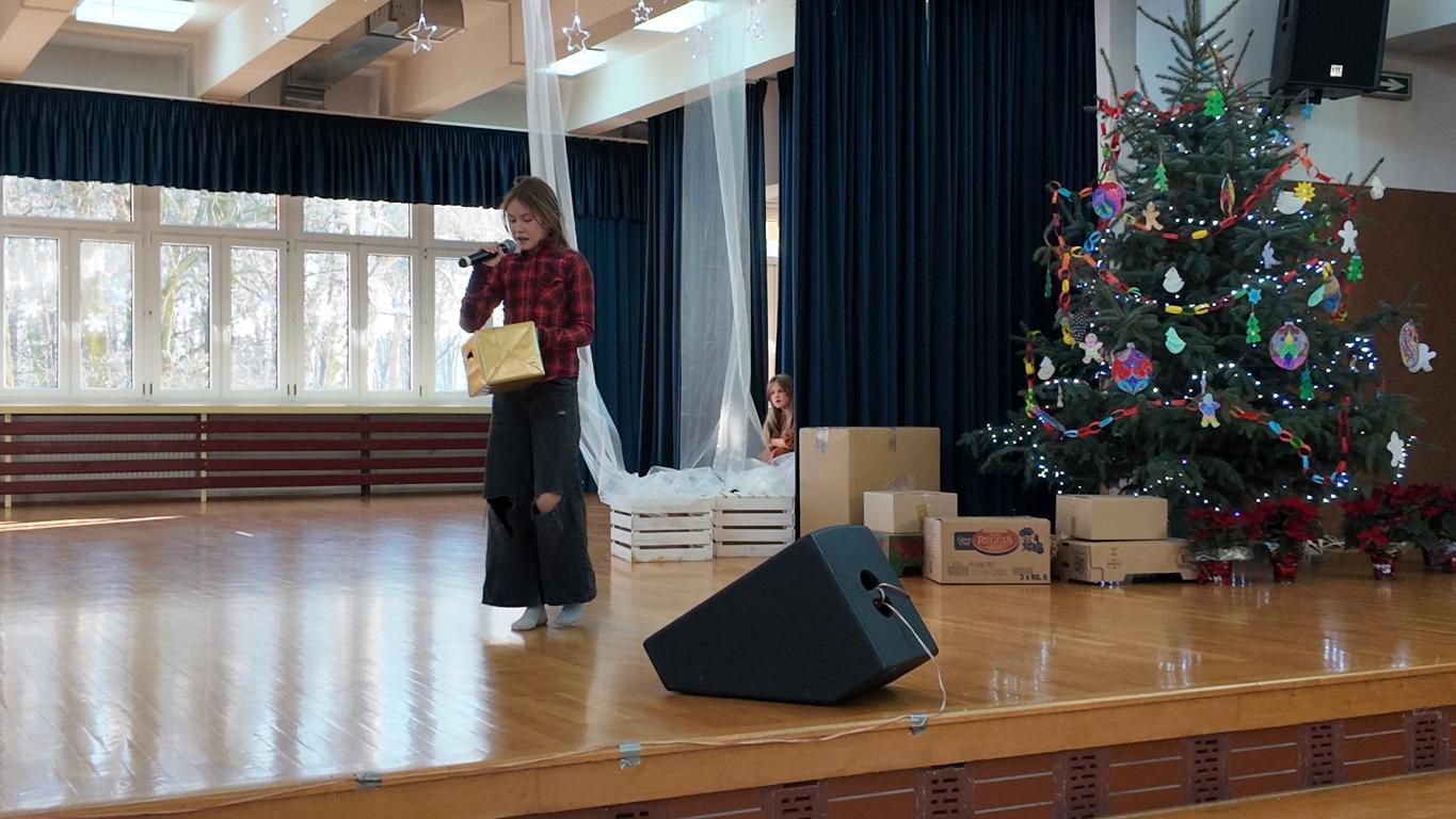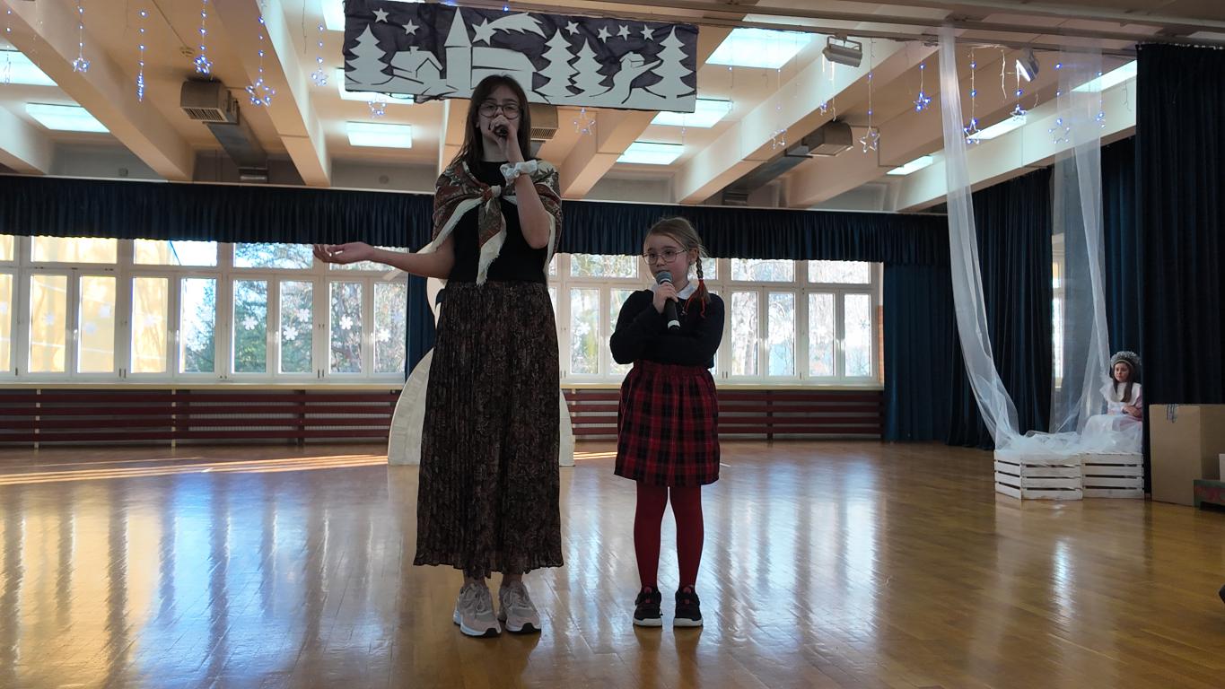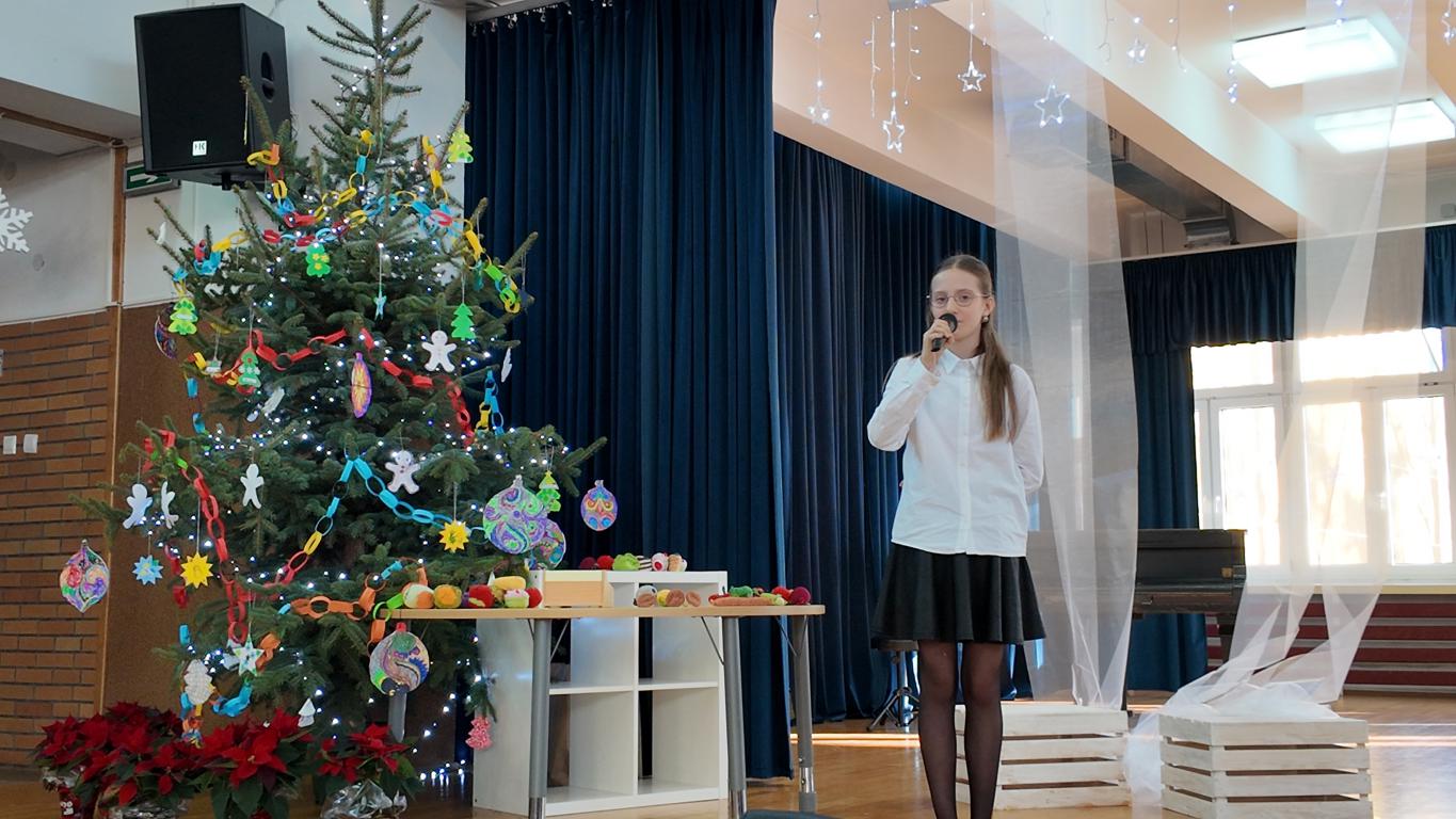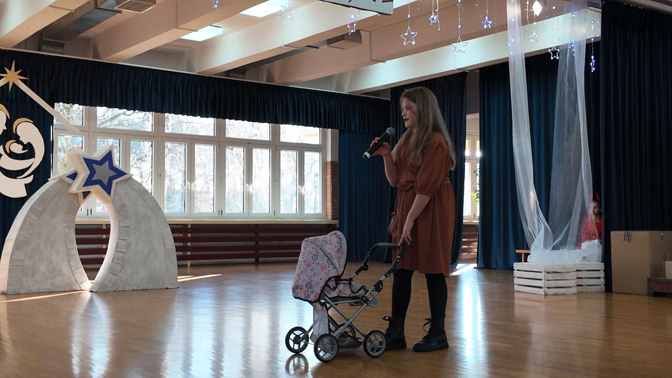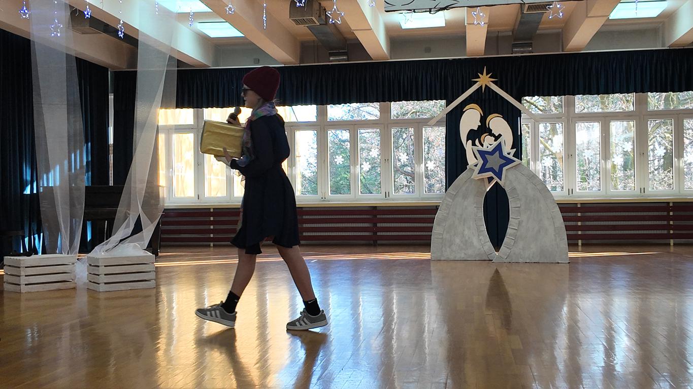 Podczas jasełek nie zabrakło pięknych występów artystycznych naszych uczniów. Były śpiewy, gra na skrzypcach, a całość dopełniał akompaniament Pani Karoliny Pawlik-Grajcar, która z wielką wrażliwością przygrywała na cyfrowym pianinie. Na zakończenie świąteczne życzenia w imieniu Samorządu Uczniowskiego złożył jego Przewodniczący Witold Szczemirski, który również wystąpił w przedstawieniu. Za profesjonalne nagłośnienie odpowiadał Pan Sylwester Dorynek, a mobilne, pomysłowe dekoracje przygotowała niezawodna Pani Barbara Zabawa, które Aniołki wykorzystywały podczas całego spektaklu. Wideorelację z wydarzenia przygotowała Pani Agnieszka Brym.