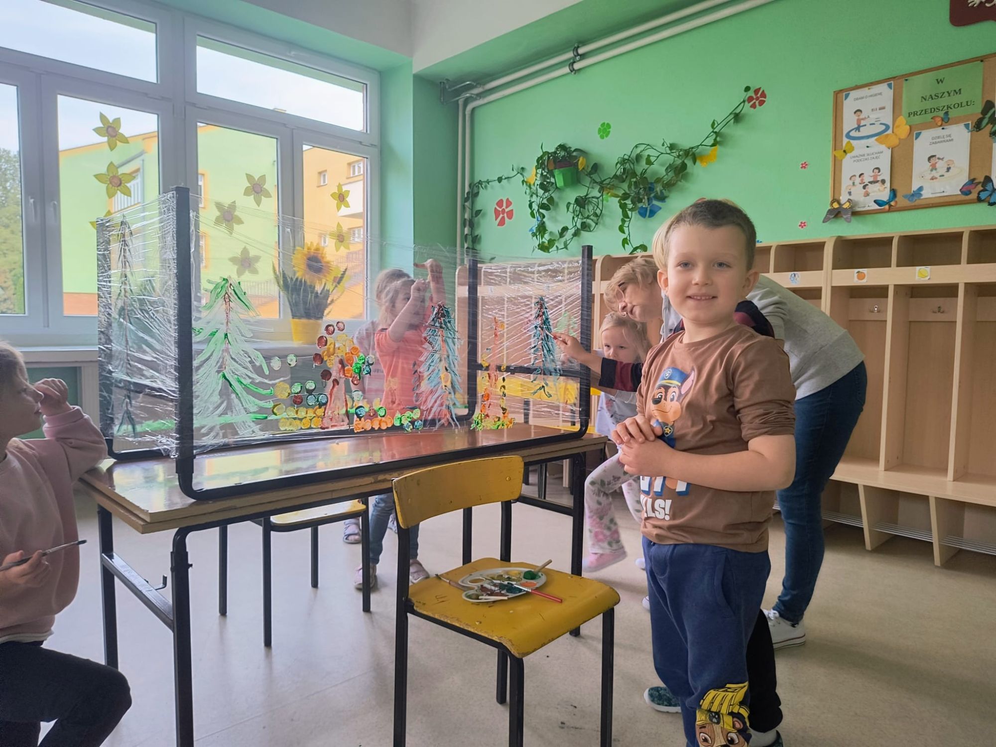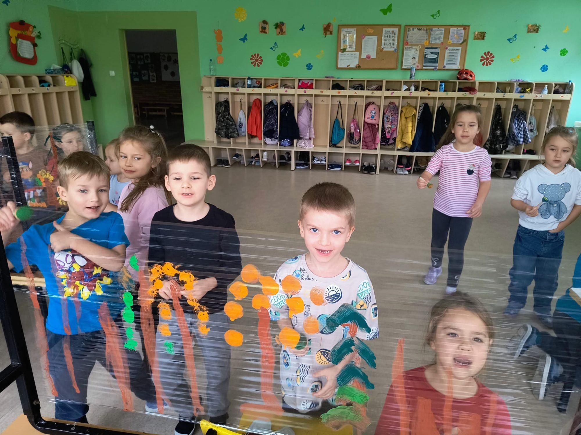 Mimo niesprzyjającej pogody, grupa Poziomki spędziła dzień w niezwykle twórczy sposób! Dzieci uczestniczyły w warsztatach plastycznych, podczas których malowały las na folii, tworząc barwne, pełne wyobraźni dzieła. Wyruszyły również w wirtualną podróż do lasu, odkrywając jego piękno i ucząc się dostrzegać naturę poprzez sztukę.