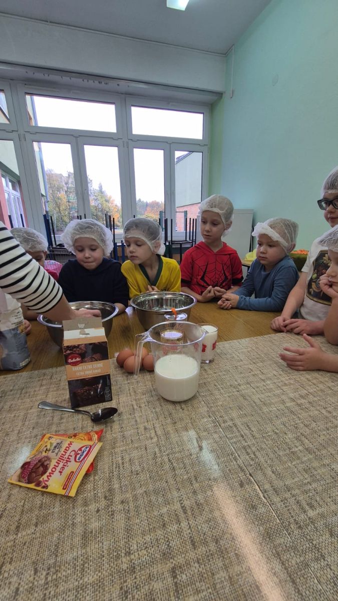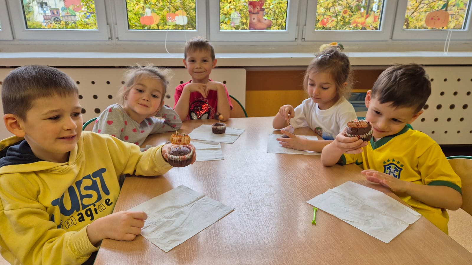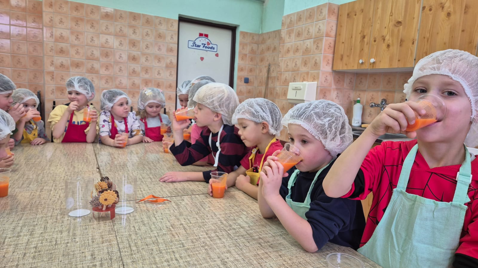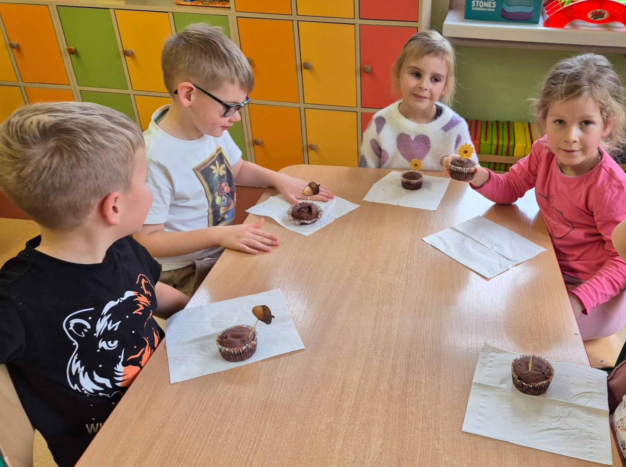 Podczas zajęć przedszkolaki z ogromnym zapałem wcieliły się w rolę małych kucharzy. Dzieci przygotowywały pyszne czekoladowe muffinki z dżemem dyniowo-jabłkowym oraz świeżo wyciskany sok marchewkowo-jabłkowy, który z apetytem wypiły. Przy okazji poznały walory smakowe i zdrowotne warzyw oraz owoców.
