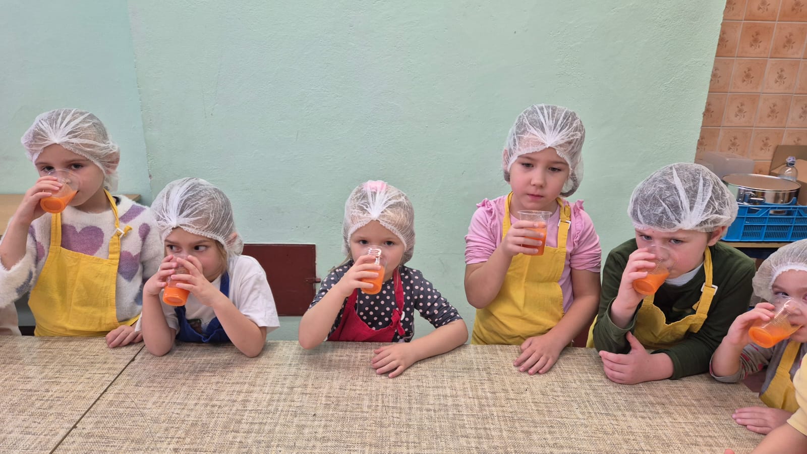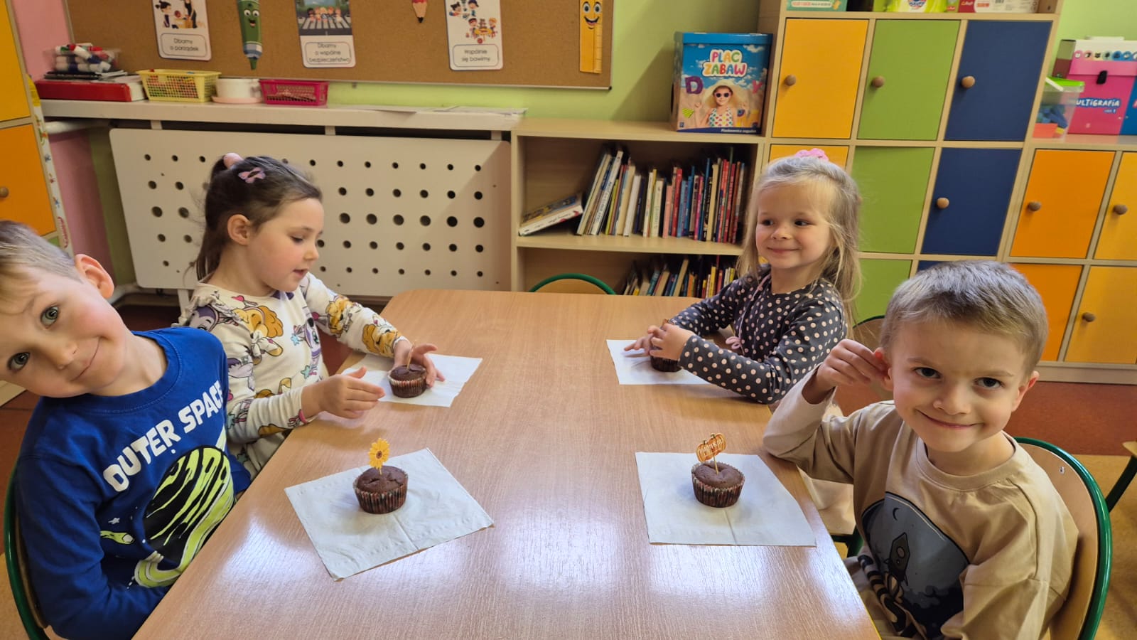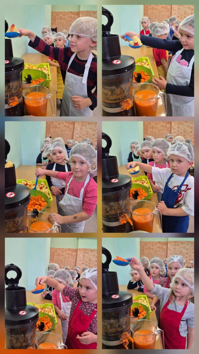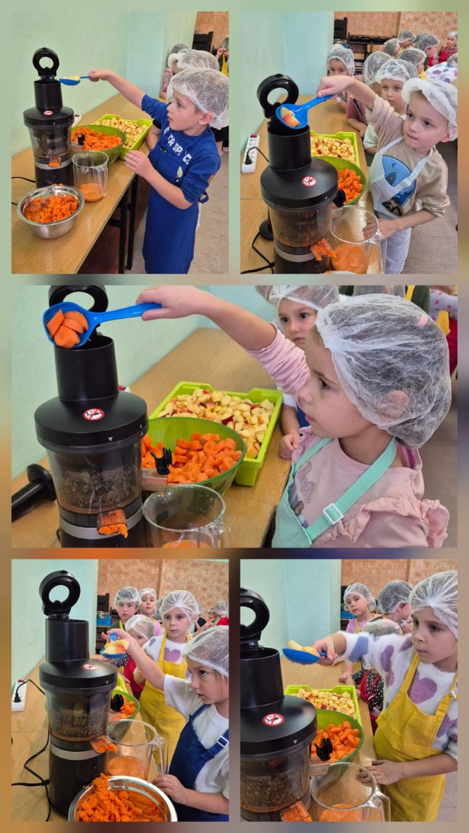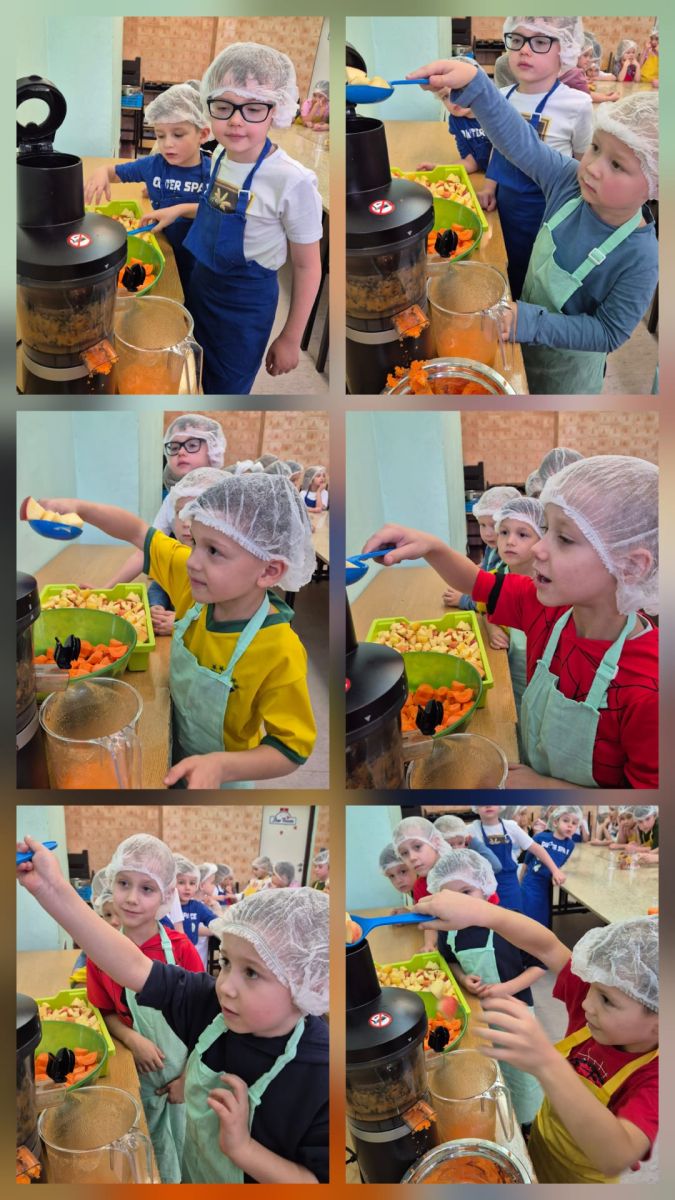 Podczas zajęć przedszkolaki z ogromnym zapałem wcieliły się w rolę małych kucharzy. Dzieci przygotowywały pyszne czekoladowe muffinki z dżemem dyniowo-jabłkowym oraz świeżo wyciskany sok marchewkowo-jabłkowy, który z apetytem wypiły. Przy okazji poznały walory smakowe i zdrowotne warzyw oraz owoców.